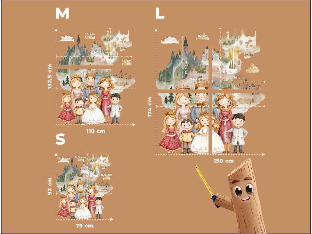 Veselá farebná nálepka zobrazujúca kráľa, kráľovnú a ich päť detí prinesie do detskej izby rozprávkovú atmosféru. Tento hravý motív podporuje fantáziu a kreativitu detí, zároveň vytvára útulné a veselé prostredie.