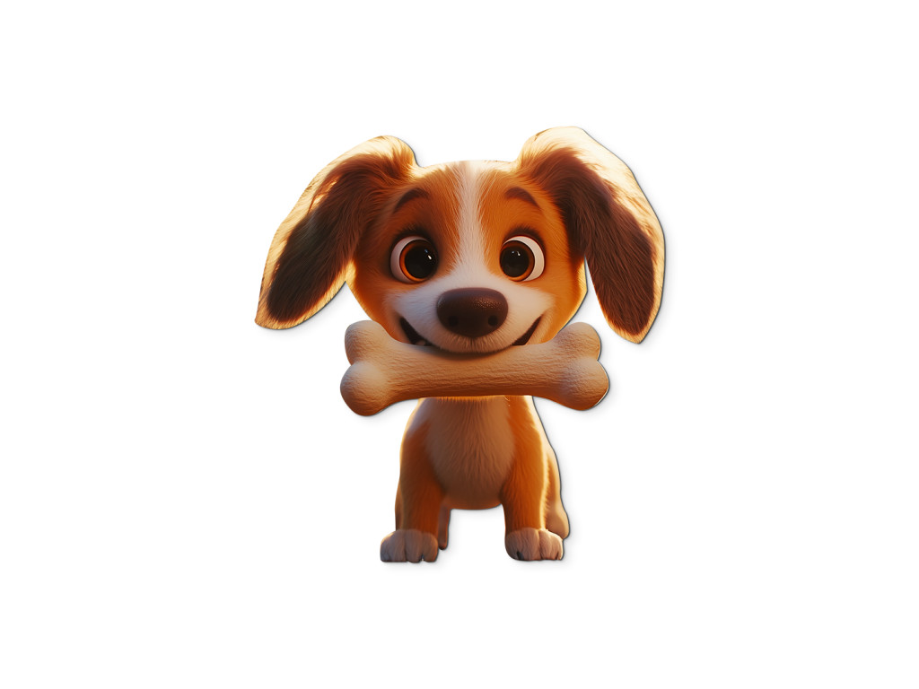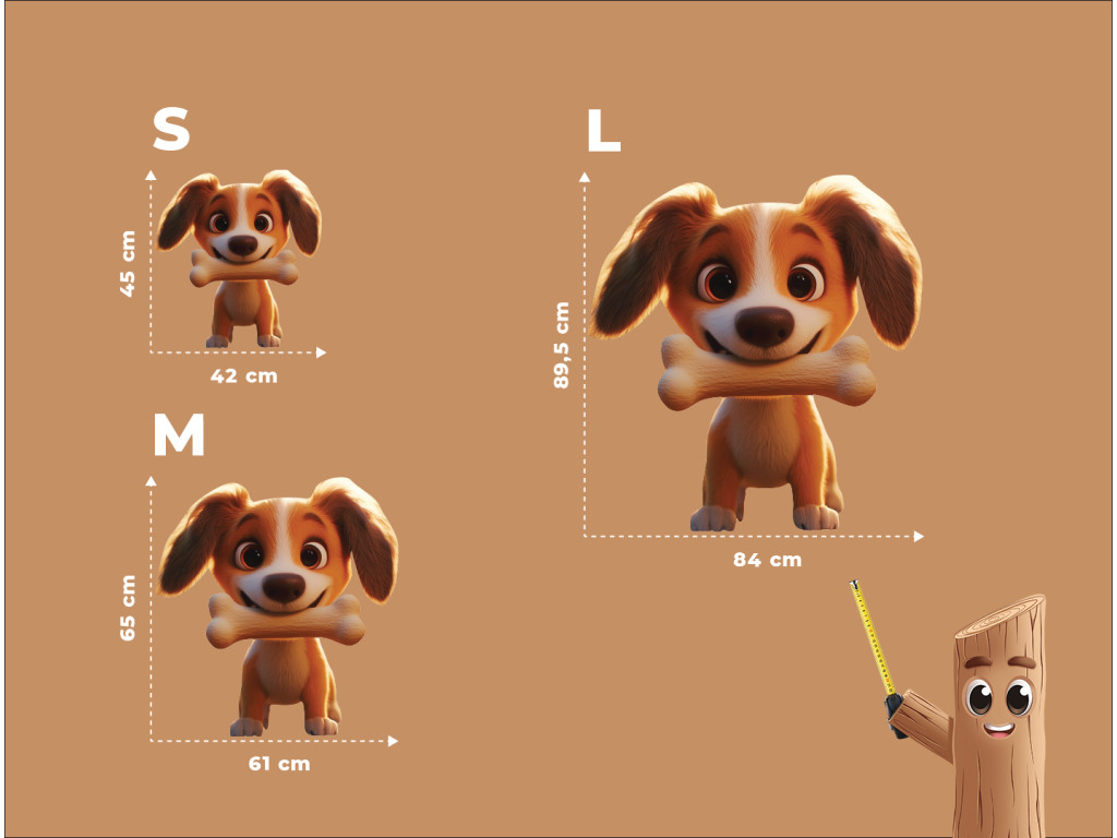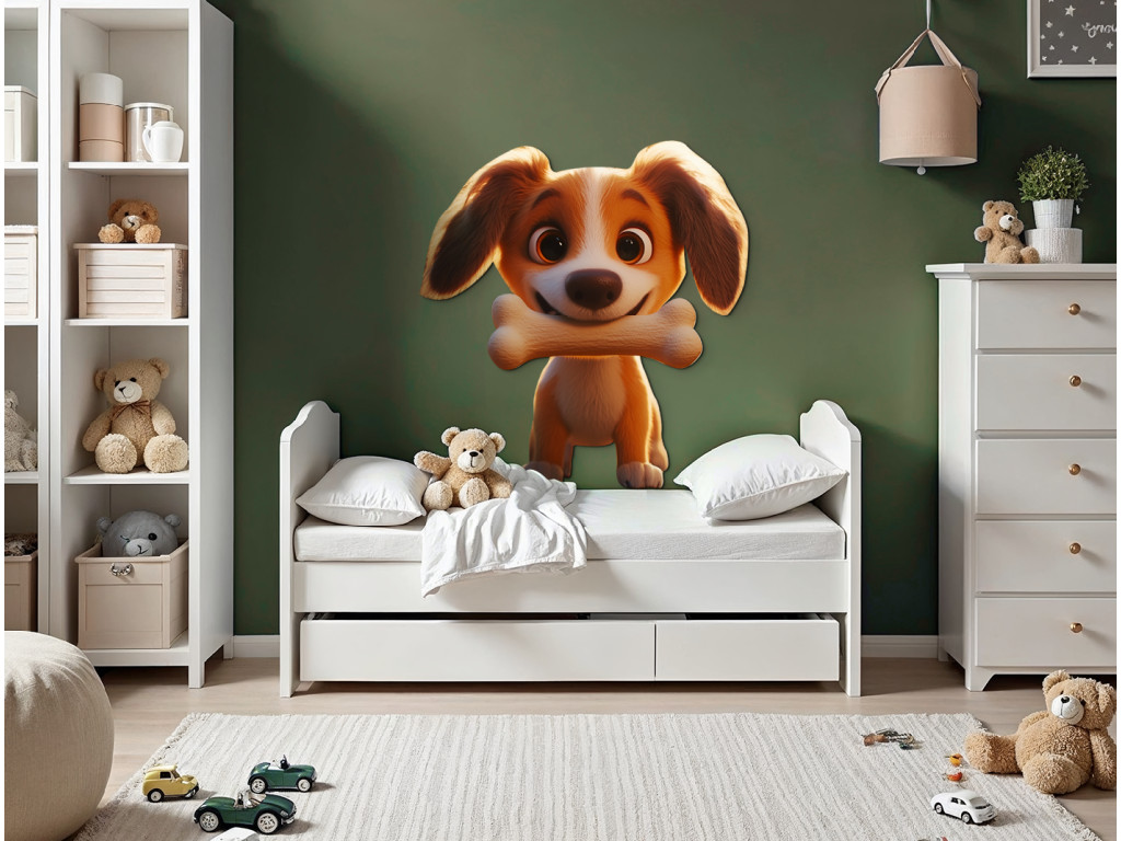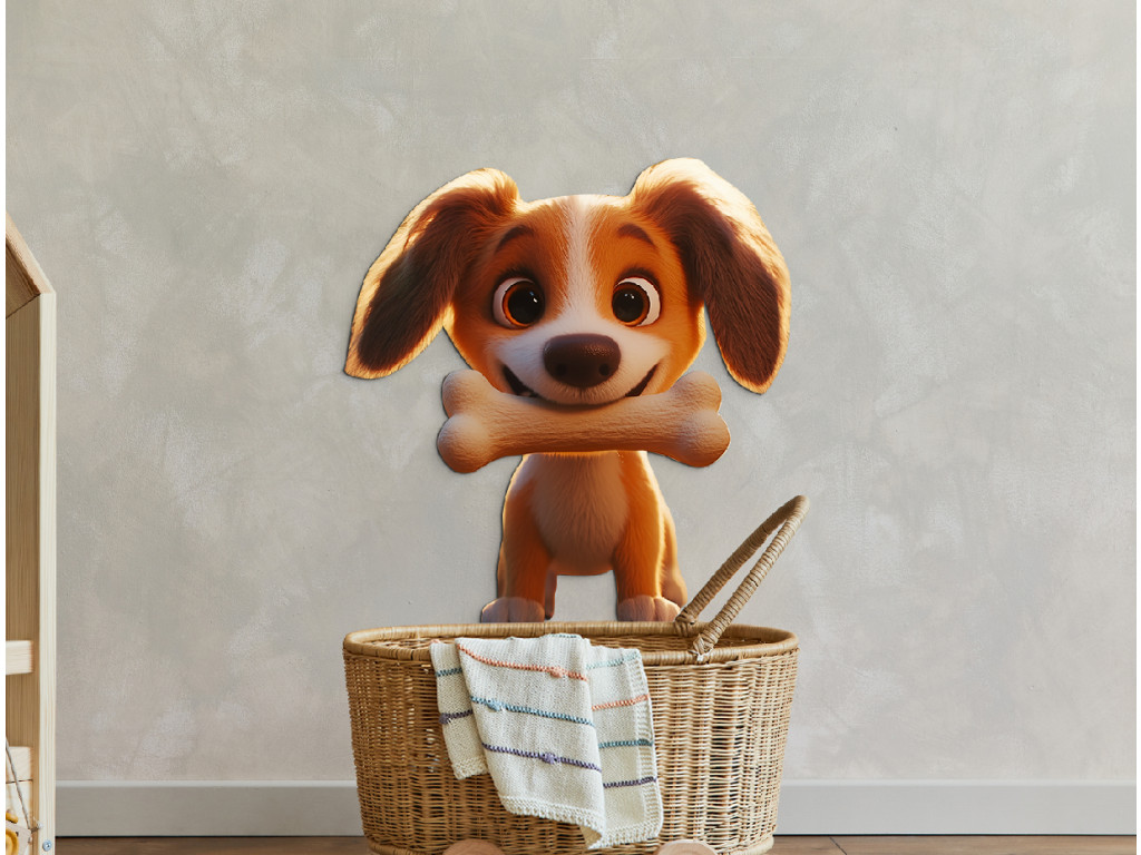 Táto roztomilá nástenná dekorácia zobrazuje animovaného psíka, ktorý spokojne drží svoju obľúbenú kosť. Jemné línie a priateľský výraz robia z tohto motívu ideálny doplnok do detskej izby. Skvele sa hodí pre malých milovníkov zvierat a rozkošných ilustrácií.