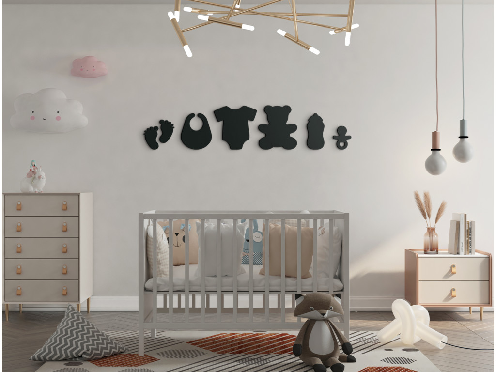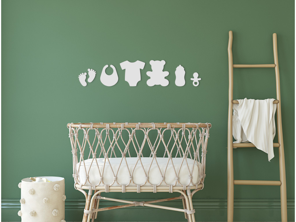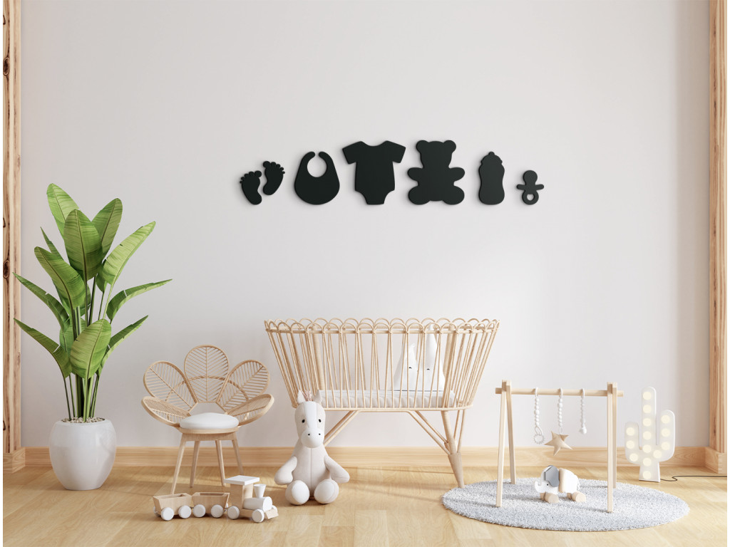 Prineste do detskej izby závan veselého smiechu a nevinnej zábavy. Drevená dekorácia s vyobrazením prvkov pre novorodeniatko navodí v miestnosti príjemnú a útulnú atmosféru.