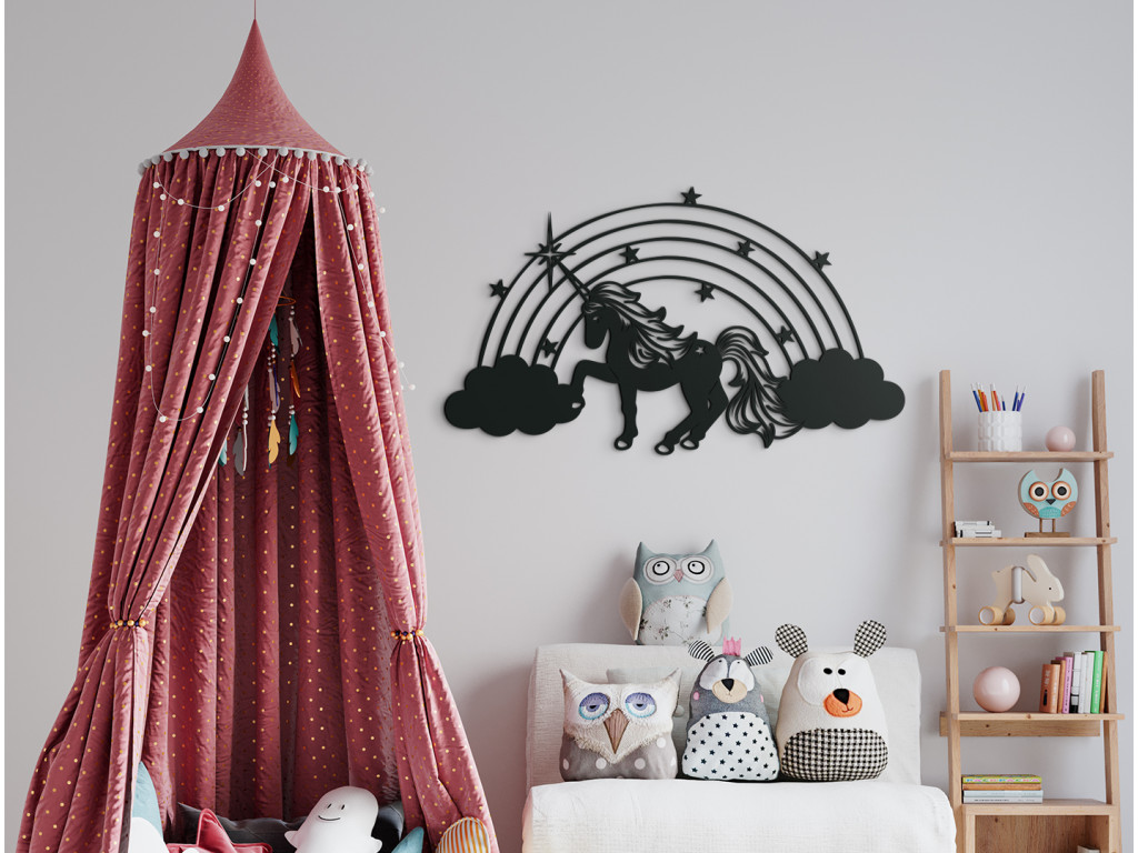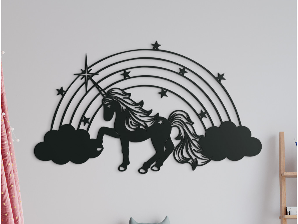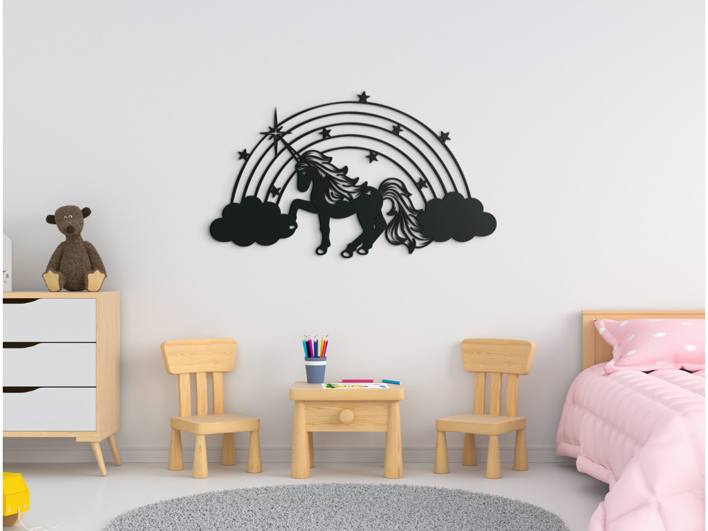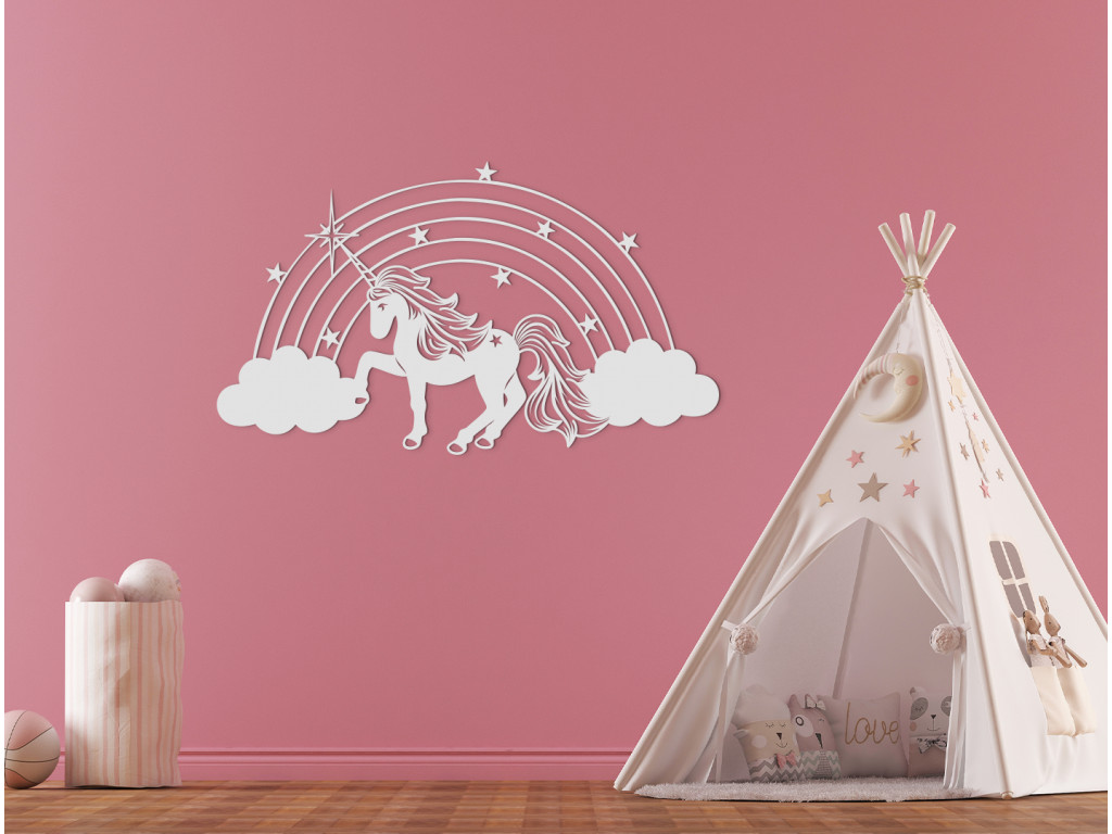Drevená nálepka do detskej izby s motívom jednorožca zaujme každú malú slečnu. Ústrednou postavou dekorácie je nádherný jednorožec so zvlnenou hrivou a rozviatym chvostom, hrabúci kopýtkom medzi oblakmi. Z obláčikov sa na pozadí dvíha dúha, ktorá je vyšperkovaná hviezdičkami.