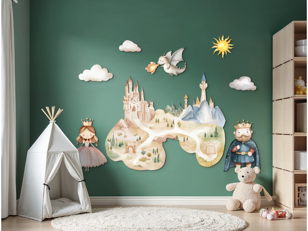 Rozprávková dekorácia na stenu zobrazujúca nádherný hrad uprostred čarovnej krajiny, kde žije kráľ, princezná a priateľský drak. Jemné farby a veselý kreslený štýl vytvárajú kúzelnú atmosféru, ktorá prenesie deti do sveta fantázie a dobrodružstiev. Skvelý doplnok do detskej izby pre všetkých malých milovníkov rozprávok.