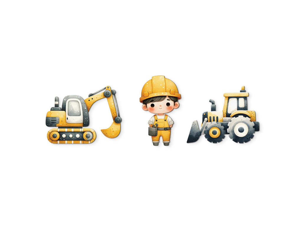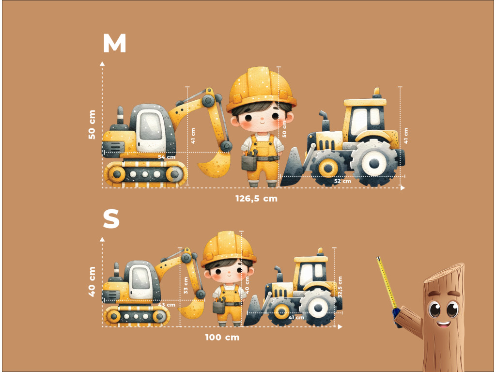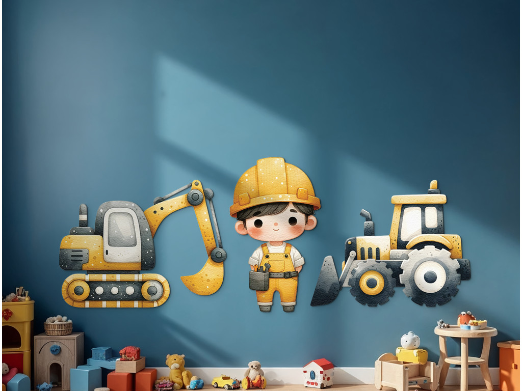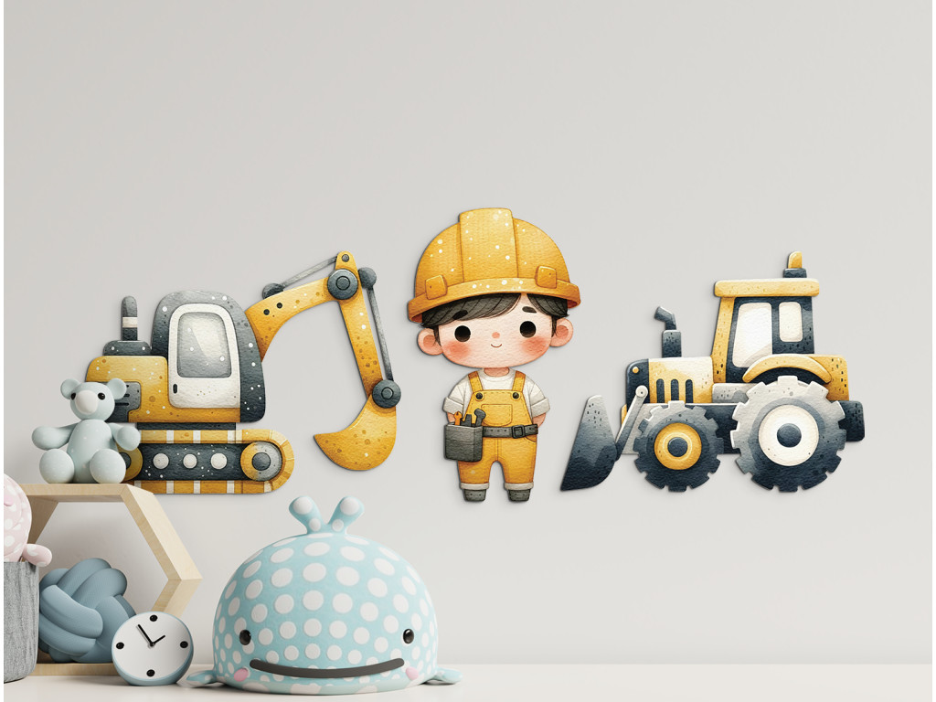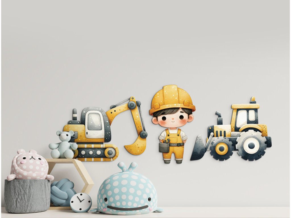 Sada detských nálepiek na stenu s motívom staveniska prináša do izby energiu a hravosť. Obsahuje žltý bager, robustný buldozér a postavičku robotníka pripraveného na prácu. Tlmené žlté a sivé odtiene ladia s detským interiérom a podporujú tvorivú fantáziu malých staviteľov.