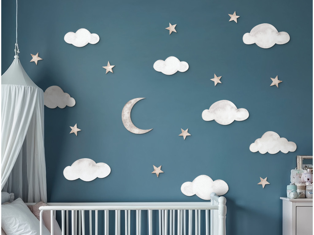 Jemná dekorácia, ktorá prinesie do izby kúzlo nočnej oblohy. Sada obsahuje obláčiky, hviezdičky a polmesiac, ktoré spolu vytvoria pokojné a snové prostredie. Ideálna na vytvorenie útulnej atmosféry v detskej izbe či kútiku na spanie.