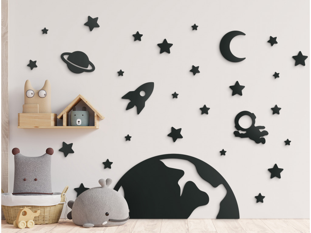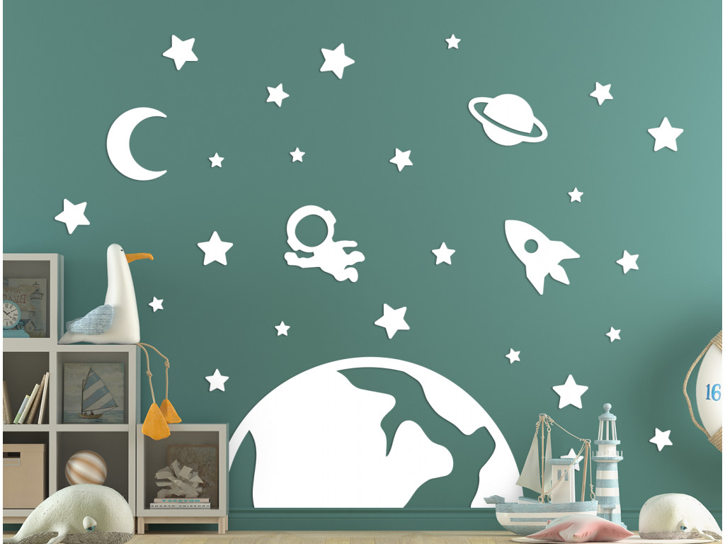Vytvorte z detskej izby miesto, kde sa dieťa bude cítiť dobre. Zútulnite ju detskou sadou nálepiek s témou veľkolepého vesmíru. Sada obsahuje hviezdičky, astronauta, Saturn, raketu, Mesiac a Zemeguľu. Za výhodnú cenu tak získate viacero nálepiek.