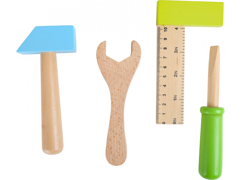 Opasok s náradím je skvelou hračkou pre malých domácich majstrov, ktorí napodobňujú svojho otecka. K dispozícii majú všetko, čo budú potrebovať na opravu v detskej izbe. Nechýba uhlomer, skrutkovač, kladivo, kľúč, skrutky a masívne drevené matice.