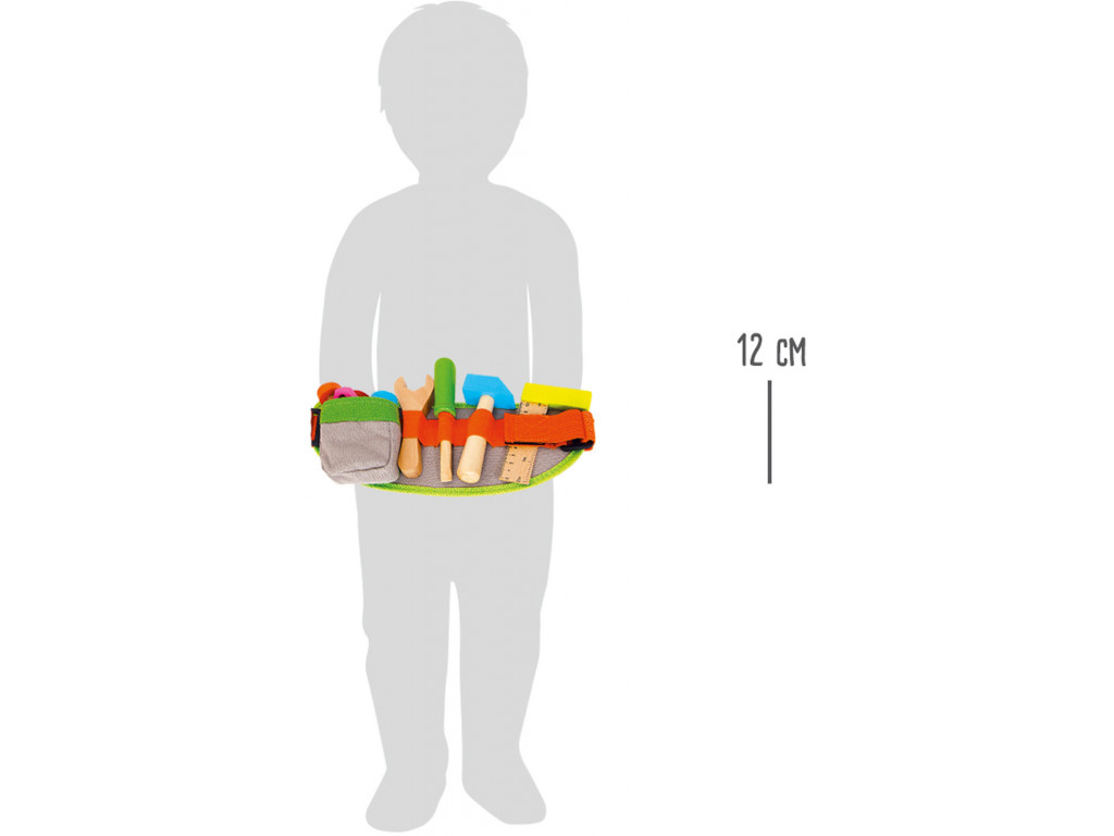 Pre malých domácich majstrov. S týmto farebným pásom majú malí remeselníci všetko, čo potrebujú, poruke. Uhlomer, skrutkovač, kladivo, kľúč, tri skrutky a 5 masívnych drevených matíc, všetko farebne namaľované. Pohodlné pre akúkoľvek naliehavú opravu v detskej izbe. Pevná nylonová pracka sa dá rýchlo a jednoducho odopnúť a zapnúť.