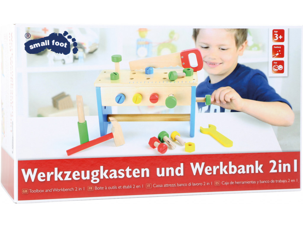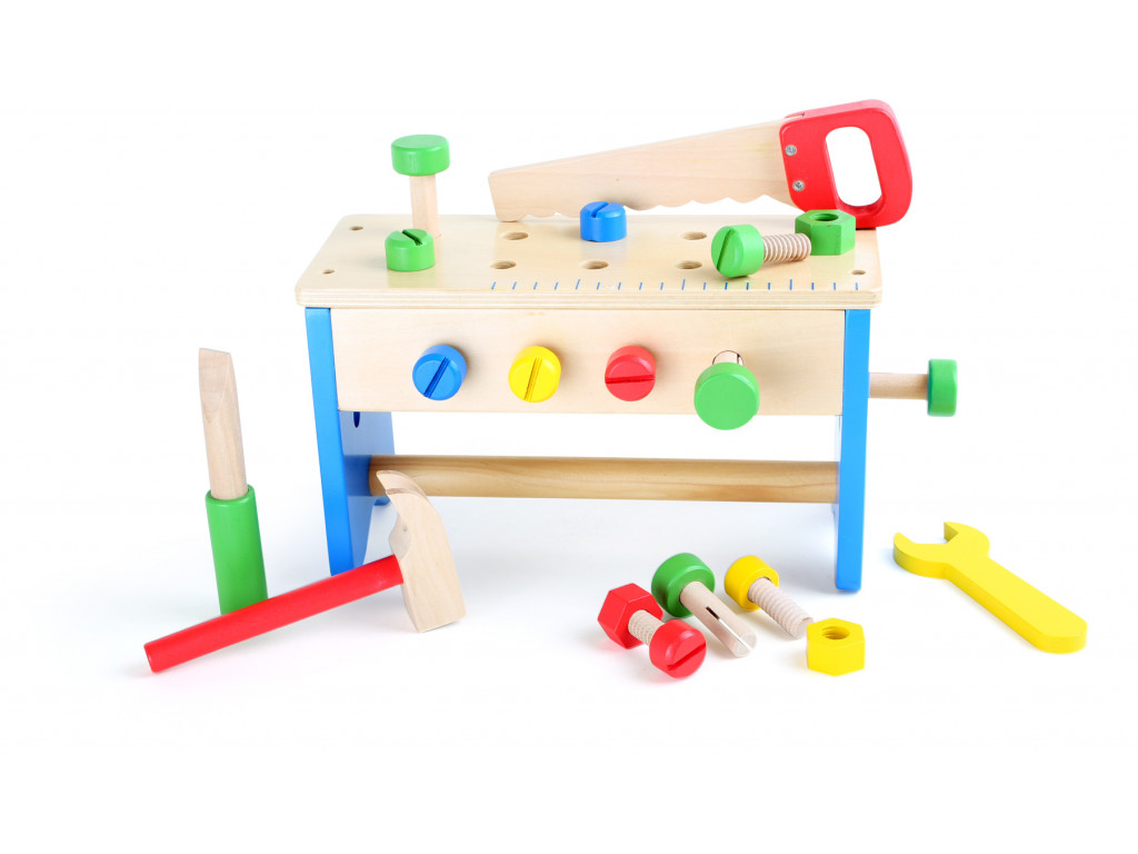Žiarivé farby dúhy v kombinácii s prírodným materiálom učaria každému kutilovi. S týmto dreveným stolíkom sa môžu deti pri hre naučiť manuálnej zručnosti. Obsahuje nástroje ako kladivo, pílku, dláto, francúzsky kľúč a množstvo príslušenstva na trénovanie jemnej motoriky. Deti môžu pomôcť pri zložení ponku a dokázať tak, že majú talent pre ručnú prácu. Je to skvelá hračka pre chlapcov aj dievčatá, vďaka ktorej môžu píliť, zatĺkať, merať a skrutkovať. Po prevrátení hračky stolík slúži ako úložný box s rukoväťou. Súčasťou balenia je všetko podľa obrázku.