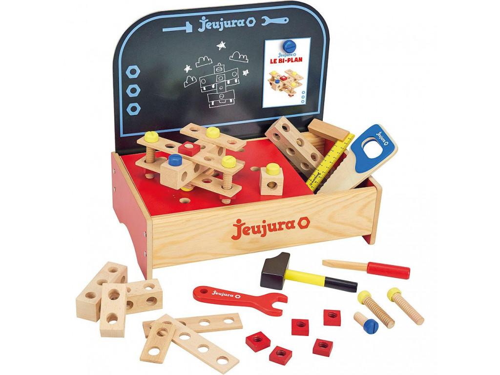 Každý kutil túži po vlastnom pracovnom stole. Je vybavený nielen pracovnou doskou a úložným priestorom, ale aj obojstrannou tabuľou, ktorá je magnetická a je možné na ňu písať či kresliť kriedami aj vhodnými fixkami. Je tiež dodávaný s bohatým príslušenstvom, náradím a ďalšími dielmi stavebnice. S radom stavebnice pre malých kutilov môže Vaše dieťa dať voľný priechod svojej fantázii. Jednotlivé sady tejto stavebnice sú spolu kompatibilné, možno ich dopĺňať, kombinovať a zbierať. S každou ďalšou sadou výrazne vzrastie počet možností, ktoré sa Vášmu dieťaťu otvoria. S pomocou tejto hračky je možné precvičiť jemnú motoriku, logiku a sústredenie. Váš malý vynálezca na ňu bude v dospelosti s láskou spomínať. Vyrobené vo Francúzsku, z masívneho bukového a borovicového dreva francúzskeho pôvodu. Súčasti sú ošetrené výhradne za použitia farieb a lakov na báze vody. Sada je balená v krabici potlačenej rastlinnými atramentmi a súčasťou balenia sú karty so vzorovými stavbami a ich detailmi.