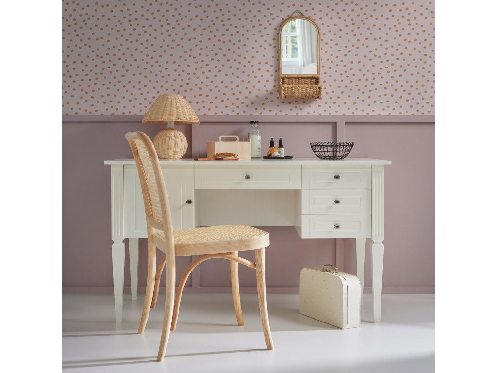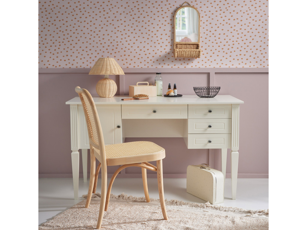 Pracovný stolík do detskej izby Ines bol navrhnutý s dôrazom pre detail, v jednoduchom a minimalistickom dizajne. Má štyri priestranné zásuvky a skrinku, do ktorých sa zmestí množstvo drobností, nevyhnutných pre každého študenta či školáka.