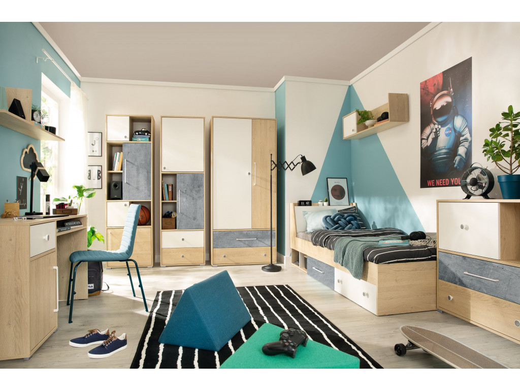 Študenti a žiaci vždy ocenia kvalitný písací stôl, pri ktorom sa každý deň môžu pripravovať do školy. Detský písací stôl Step je vybavený 1 zásuvkou a policami za dvierkami, do ktorých môžete odložiť pomôcky do školy, zošity, počítač a iné. Pod hlavnou písacou doskou nájdete otvorenú policu na na papiere a knihy. Písací stôl žiari troma odtieňmi - prírodná, biela a sivá.