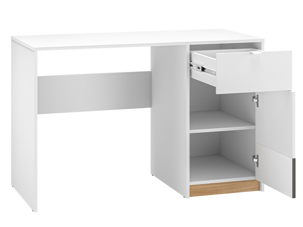 Písací stolík Torino 08 predstavuje štýlové a funkčné riešenie pre detské aj študentské izby. Je vybavený jednou zásuvkou a skrinkou, ktoré poskytujú dostatok priestoru na uschovanie školských potrieb, kníh a iných drobností. Vizuálne zaujme modernou kombináciou matnej bielej, dubu castello a grafitového vrúbkovaného pásu, čo mu dodáva súčasný a elegantný vzhľad, ideálny do interiérov pre mladých.