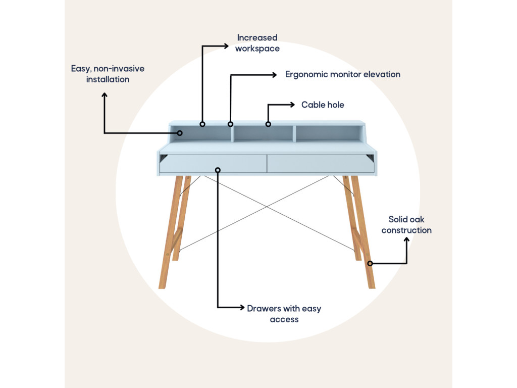 Nadstavec na stôl Lotta je praktickým doplnkom, ktorý zvýši pohodlie každého pracovného priestoru detí, tínedžerov, ale aj dospelákov. Jeho jednoduchá inštalácia umožňuje rýchle umiestnenie na stôl bez nutnosti montáže. Nadstavec poskytuje väčší pracovný priestor a zároveň ergonomické vyvýšenie monitora, čo pomáha zlepšiť správne držanie tela a komfort pri práci. Súčasťou dizajnu je aj praktický otvor pre organizáciu káblov.