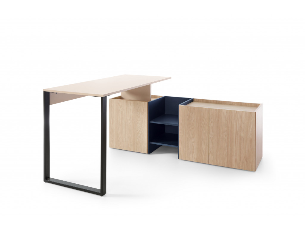Stolík Sergio je v béžovej farbe s tmavými kovovými nohami. Komoda je v dubovej farbe s modrými policami.