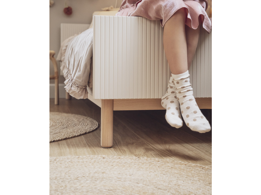 Elegantná línia detského nábytku so sviežim príjemným vzhľadom. Štýlová posteľ je vyrobená z kvalitnej MDF dosky v béžovej farbe. Nábytok spĺňa všetky európske normy z hľadiska bezpečnosti používania. Materiály používané vo výrobnom procese sú bezpečné, rovnako ako zdravotne neškodné farby. O zdravie dieťaťa sa teda obávať nemusíte. Poteší vysoká odolnosť postele voči poškriabaniu a žltnutiu vplyvom pôsobenia času. Posteľ nie je vybavená zásuvkou.