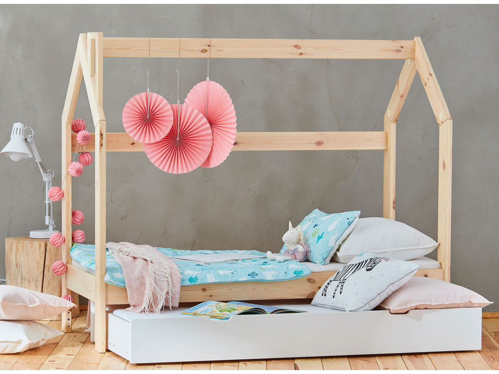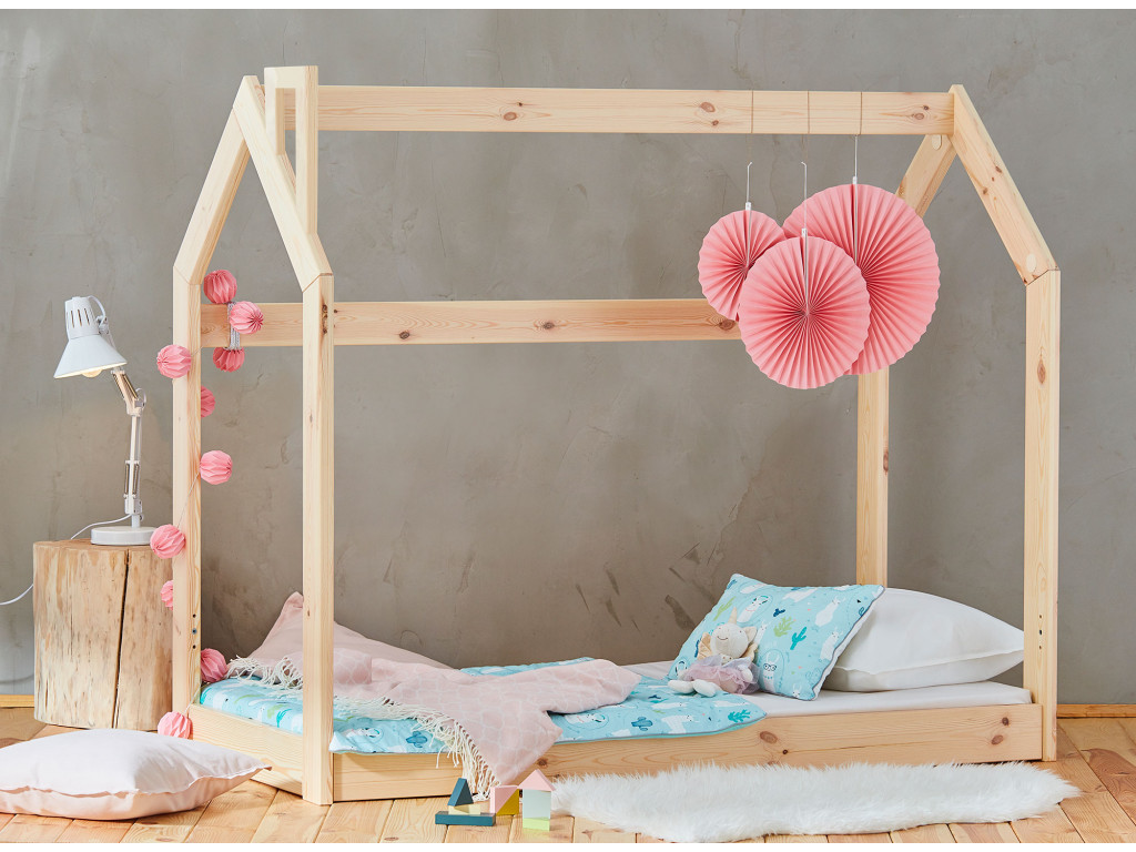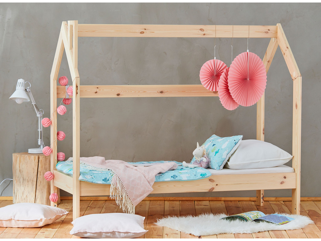 Detská posteľ pre väčšie deti a tínedžerov. Ponúka pohodlie i dekoratívny, funkčný prvok v podobe dreveného rámu, ktorý má tvar domčeka. Detská posteľ vhodná k stene i do priestoru.
