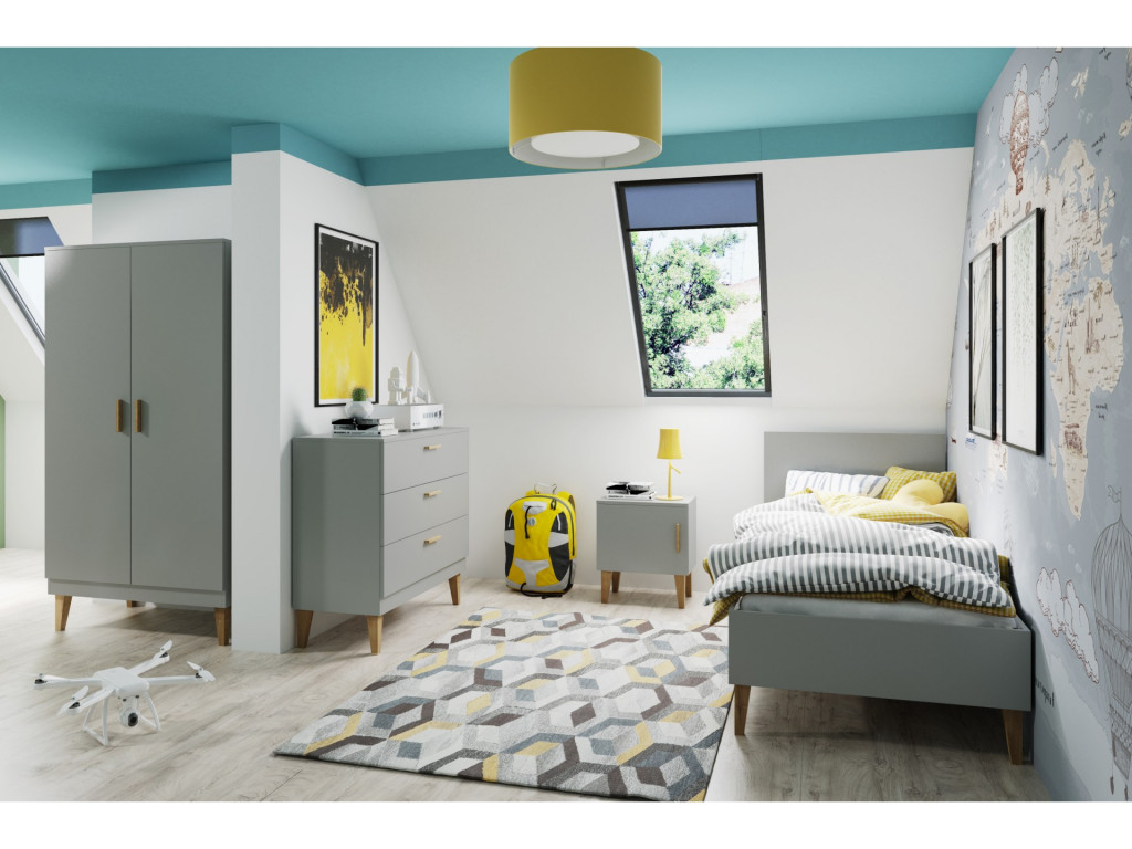Detská posteľ o rozmere 80 x 180 cm je vyrobená z laminovanej drevotriesky (18 mm) sivej farby. Posteľ je doplnená nohami z masívneho dubového dreva, natretého ekologickým, bezfarebným lakom. Posteľ je obojstranná, vďaka čomu je možné kedykoľvek jednoducho zmeniť usporiadanie izby. Rošt postele je vyrobený z prírodných brezových lamiel.