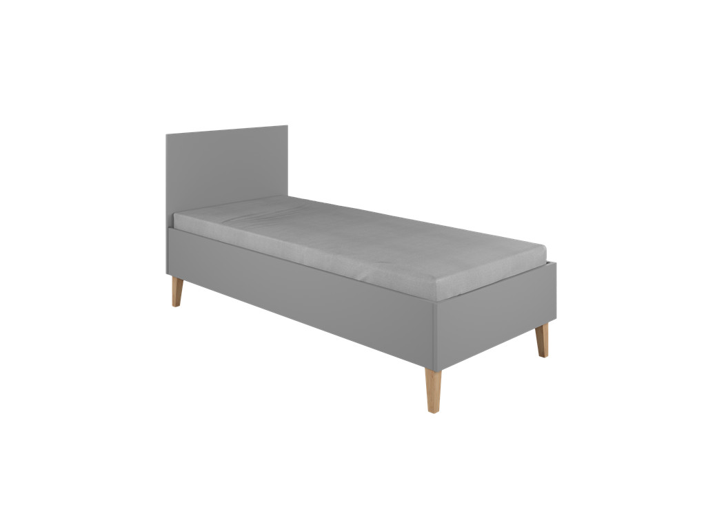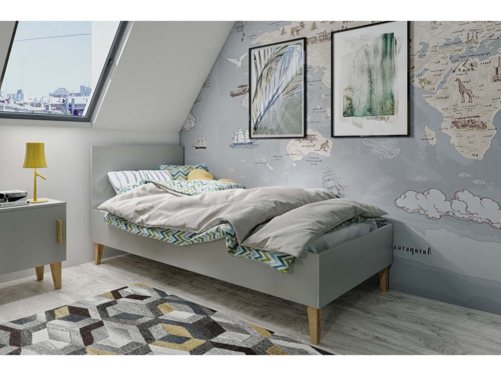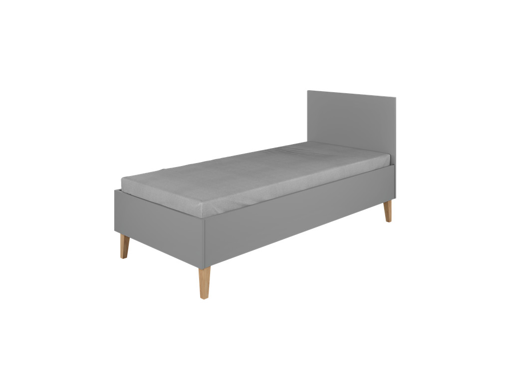 Detská jednolôžková posteľ Kubi v sivej farbe na drevených, dubových nohách. Jednoduchá a praktická posteľ, ktorú viete zladiť aj s inými kusmi nábytku z kolekcie Kubi.