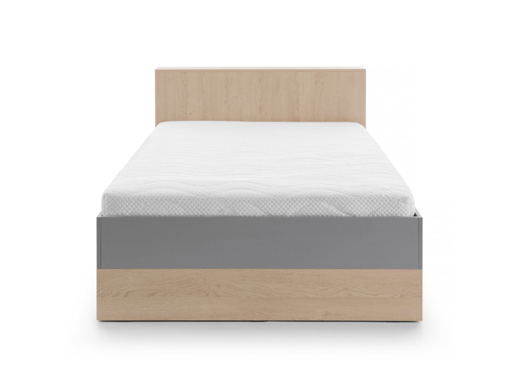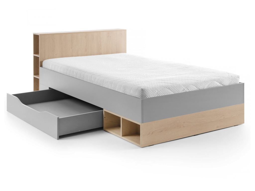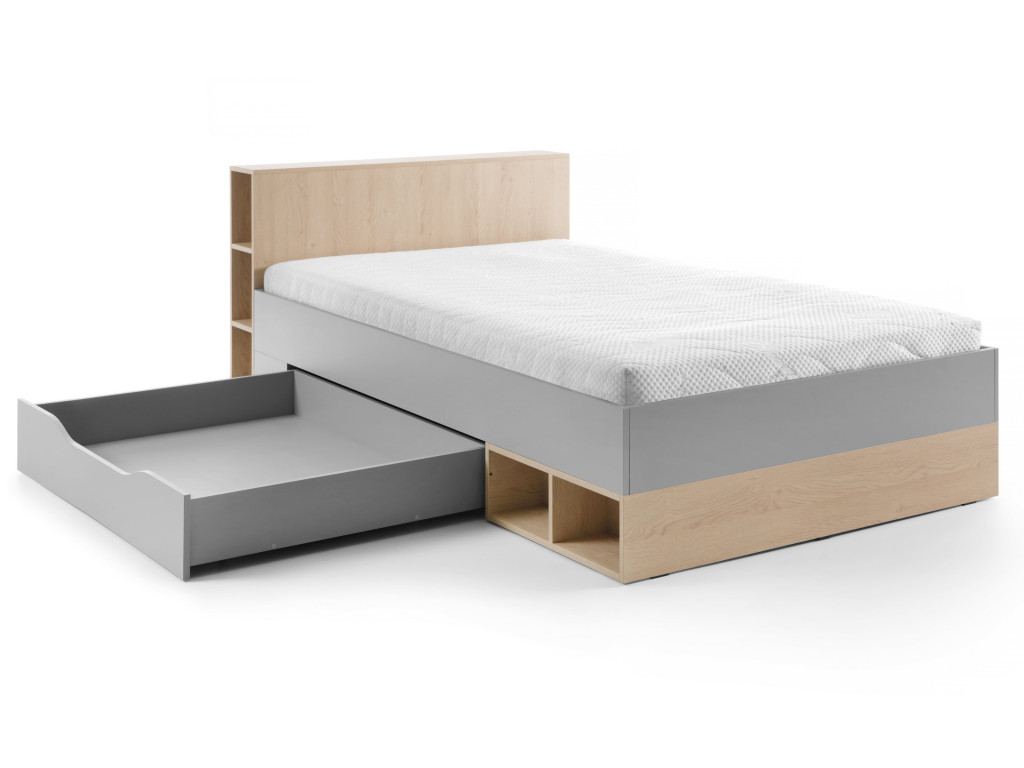 Táto posteľ v sivej a dubovej kombinácii poskytuje dostatočne široký priestor na spanie (120 × 200 cm), takže je vhodná pre deti aj tínedžerov. V čele postele sa nachádza polička, ktorú môžete využiť zhora aj z boku na odkladanie kníh či dekorácií. Pod posteľou nájdete priestranný šuflík, ktorý poslúži ako praktický úložný priestor.