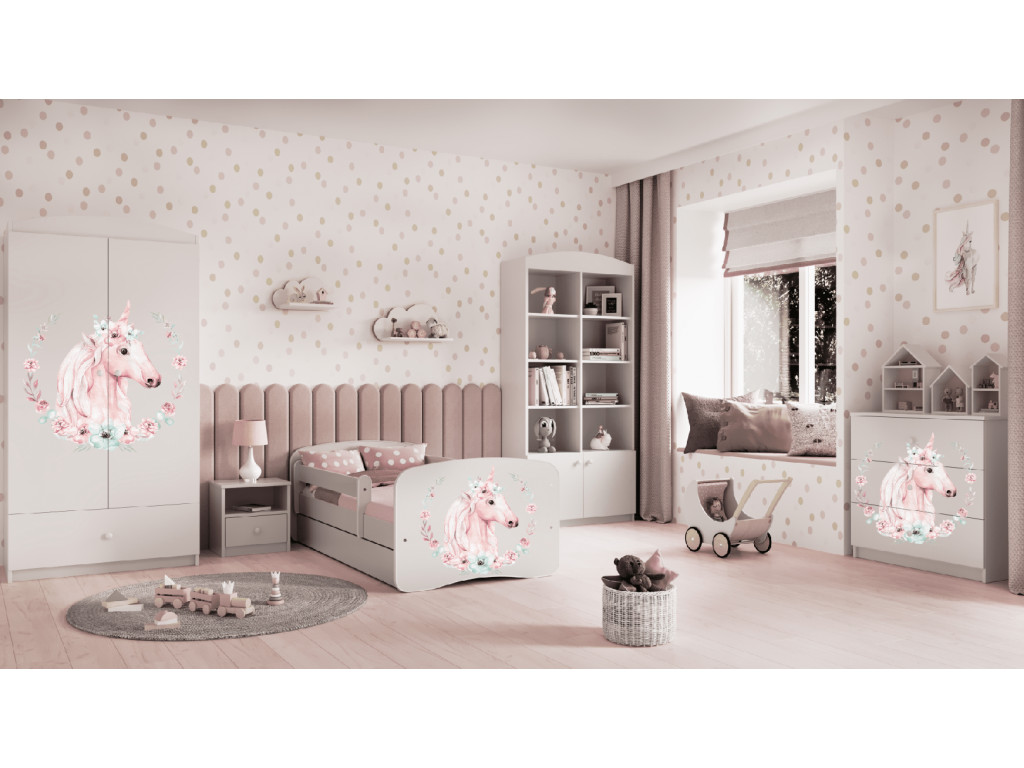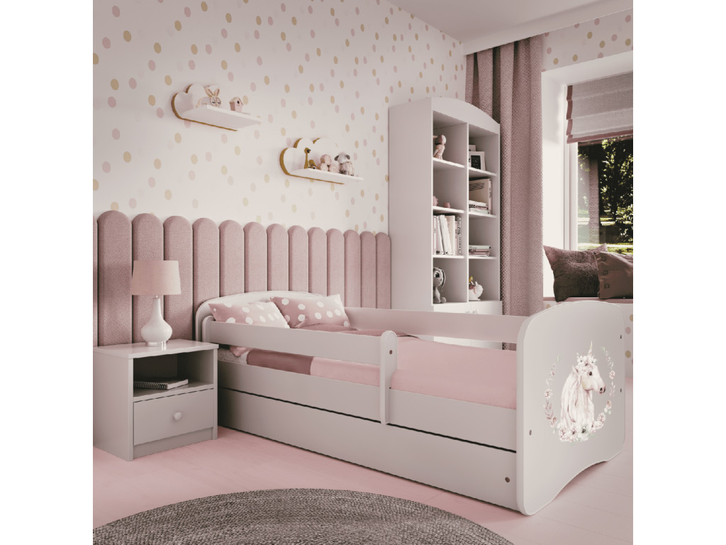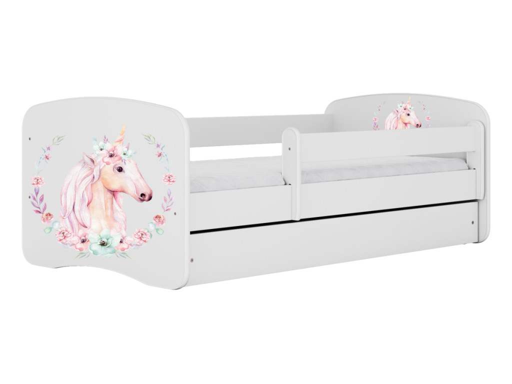 Detská posteľ so zábranou Jednorožec (biela) z kolekcie Babydreams spája rozprávkový dizajn a praktické funkcie. Je vybavená ochrannou zábranou na bezpečný spánok a zásuvkou na uloženie hračiek či oblečenia. Biely motív s jednorožcom dodáva izbe štýl a vytvára dokonalé miesto pre vaše dieťa.