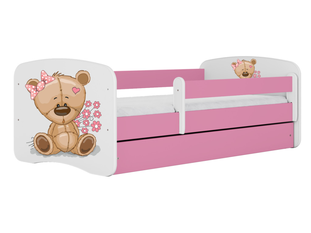 Detská posteľ Medvedík s kvietkami (ružová) z kolekcie Babydreams je stvorená pre malú princeznú, ktorá si zaslúži krásne a funkčné miesto na spánok. Spodná zásuvka poskytuje praktický priestor na hračky alebo oblečenie, zatiaľ čo odnímateľná zábrana zaručuje bezpečnosť počas noci. Jemný bielo-ružový dizajn s motívom medvedíka a kvietkov dodá izbe čarovný vzhľad.