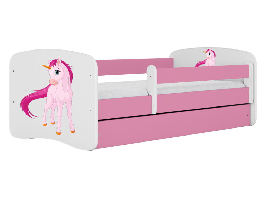Detská posteľ so zábranou Ružový jednorožec (ružová) prinesie magickú atmosféru do každej detskej izby a poteší každú malú princeznú. Priestranná zásuvka poskytuje dostatok miesta na uloženie posteľnej bielizne alebo hračiek, zatiaľ čo odnímateľná zábrana zaručuje bezpečný spánok. Jemný bielo-ružový dizajn a obojstranné prevedenie robia z tejto postele nielen krásny, ale aj praktický doplnok do detskej izby.