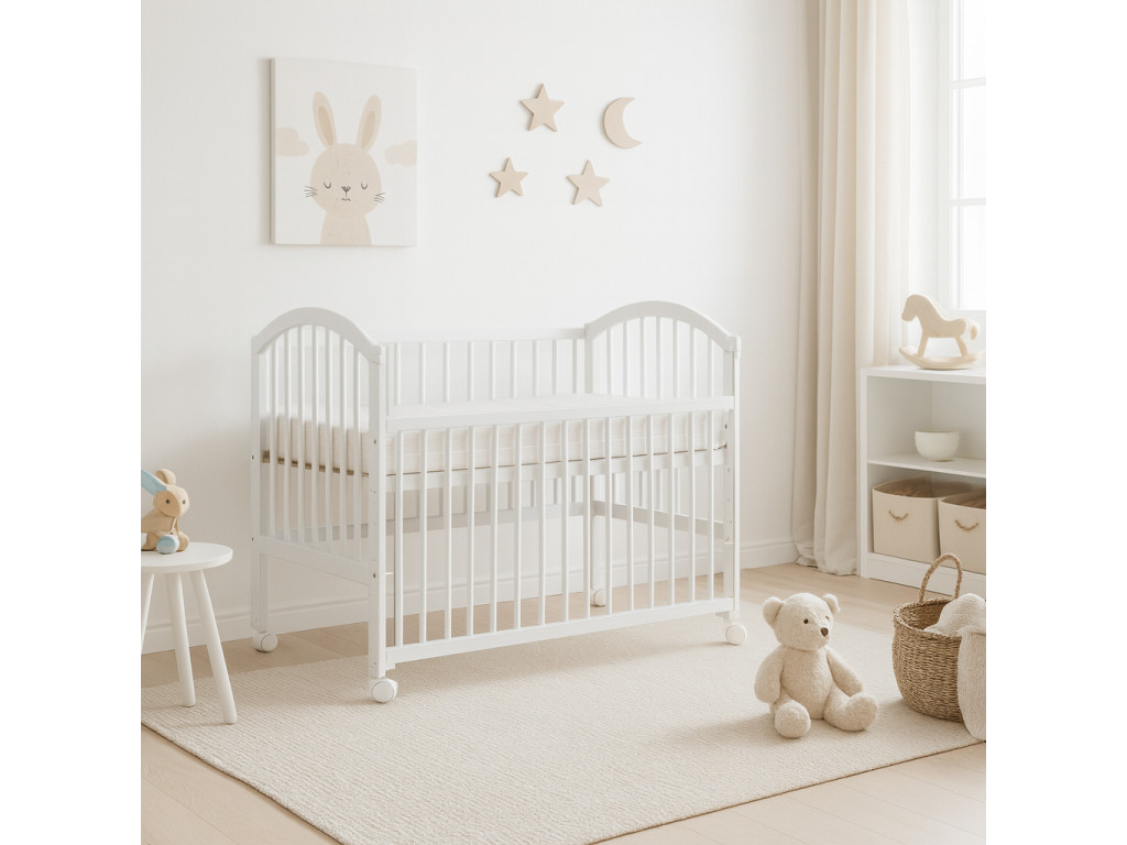 Detská postieľka z borovicového masívu obsahuje nastaviteľný rošt do piatich polôh a bočnú sťahovaciu stranu, môžete ju tak prispôsobiť novorodencovi, ale aj dieťaťu do veku do 3 rokov.