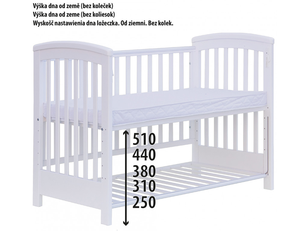 Detská postieľka z bukového masívu ponúka širokú variabilitu, bočnica sa dá na nej štandardne stiahnuť, odňať, ale aj zasunúť pod postieľku. Ponúka jednoduchšiu manipuláciu s dieťaťom, nemusíte ho pri prebaľovaní ani vyberať z postieľky. Nastaviteľný rošt sa dá nastaviť do piatich polôh, preto sa pri novorodencovi nemusíte veľmi predkláňať, rošt jednoducho nastavíte na najvyššiu polohu. Ako bude dieťa rásť rošt budete posúvať smerom nadol. Nohy postieľky majú predvŕtané otvory na kolieska, ktoré sú súčasťou postieľky.