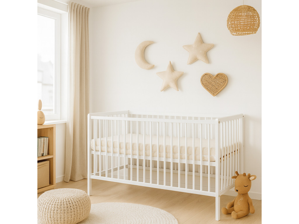 Drevená postieľka s vyberateľnými priečkami je klasikou, ktorá nikdy nesklame. Bukové drevo je zaručená kvalita. Rošt sa dá nastaviť do troch polôh, preto sa dá prispôsobiť rôznym vývojom dieťaťa.