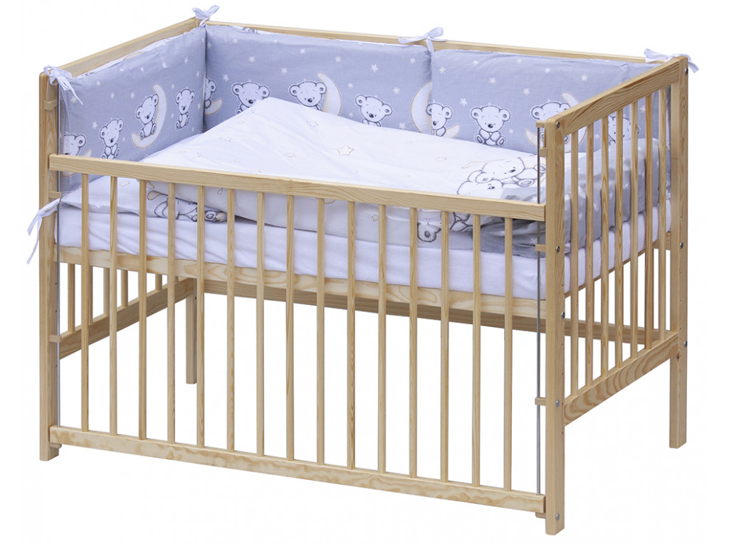 Detská postieľka z masívu (borovica) s minimalistickým dizajnom poslúži rodičom na dlhšie obdobie, pretože sa dá prispôsobiť rastu dieťaťa. Rošt postieľky sa dá nastaviť do šiestich polôh. Postupne ako dieťa rastie, rošt sa posúva smerom nadol. Postieľka má aj sťahovaciu bočnicu a tak umožňuje jednoduchšiu manipuláciu s dieťaťom. Zakúpením tejto postieľky je v cene aj kompletná súprava pre bábätko, ktorá obsahuje matrac, vankúš, perinku, plachtu a ochranný mantinel i obliečky sivej farby s detským motívom medvedíka.