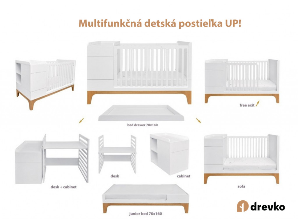 UP! To je ideálne riešenie pre každú detskú izbu. Postieľka so skrinkou, prebaľovacím pultom, zásuvkou a policami je kus nábytku, ktorý sa mení spolu s dieťaťom a prispôsobuje sa jeho potrebám. Pre dieťa je to ideálny, bezpečný priestor na spanie, zábavu, či odpočinok a pre jeho rodičov praktický, funkčný priestor na uloženie všetkých vecičiek potrebných na starostlivosť o malú ratolesť.