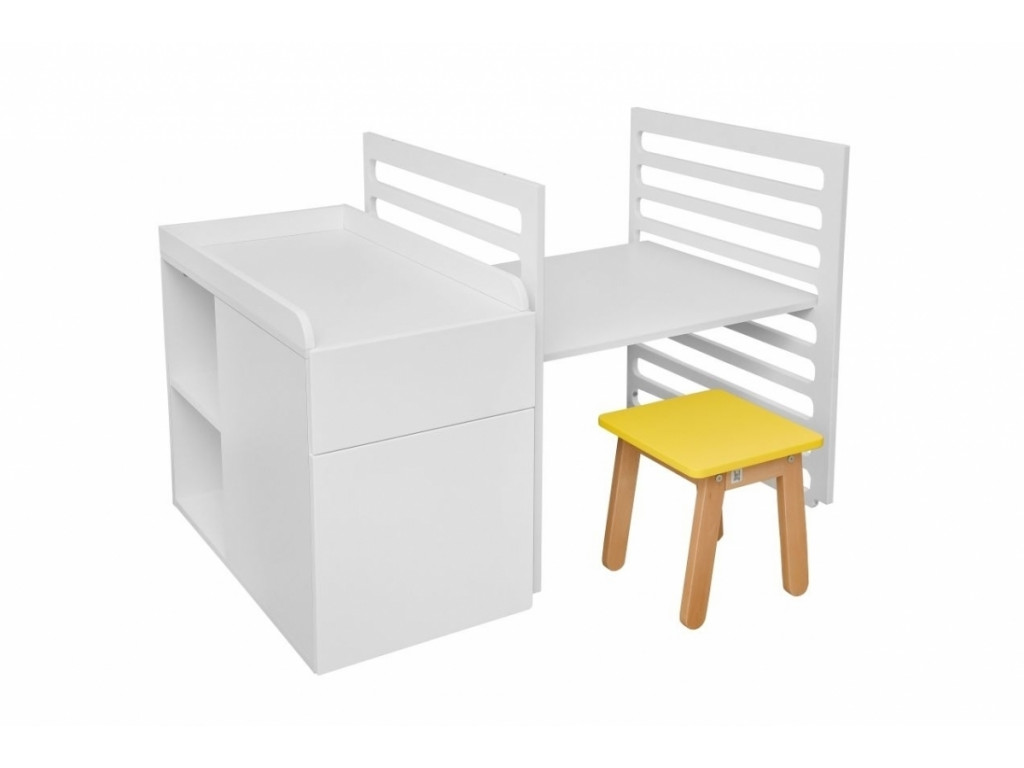 - po demontáži dvoch bočných rámov sa získa 160 cm dlhá detská posteľ, zatiaľ čo ostatné prvky sa použijú na stôl s nastaviteľnou pracovnou doskou a s praktickým úložným kontajnerom,