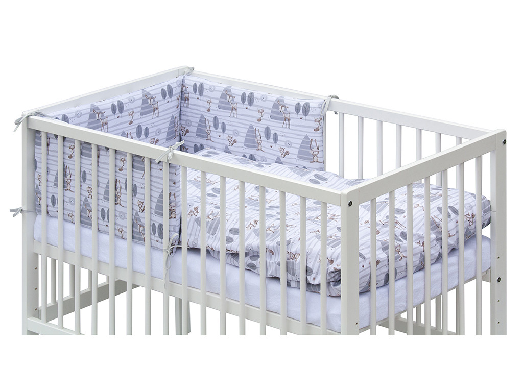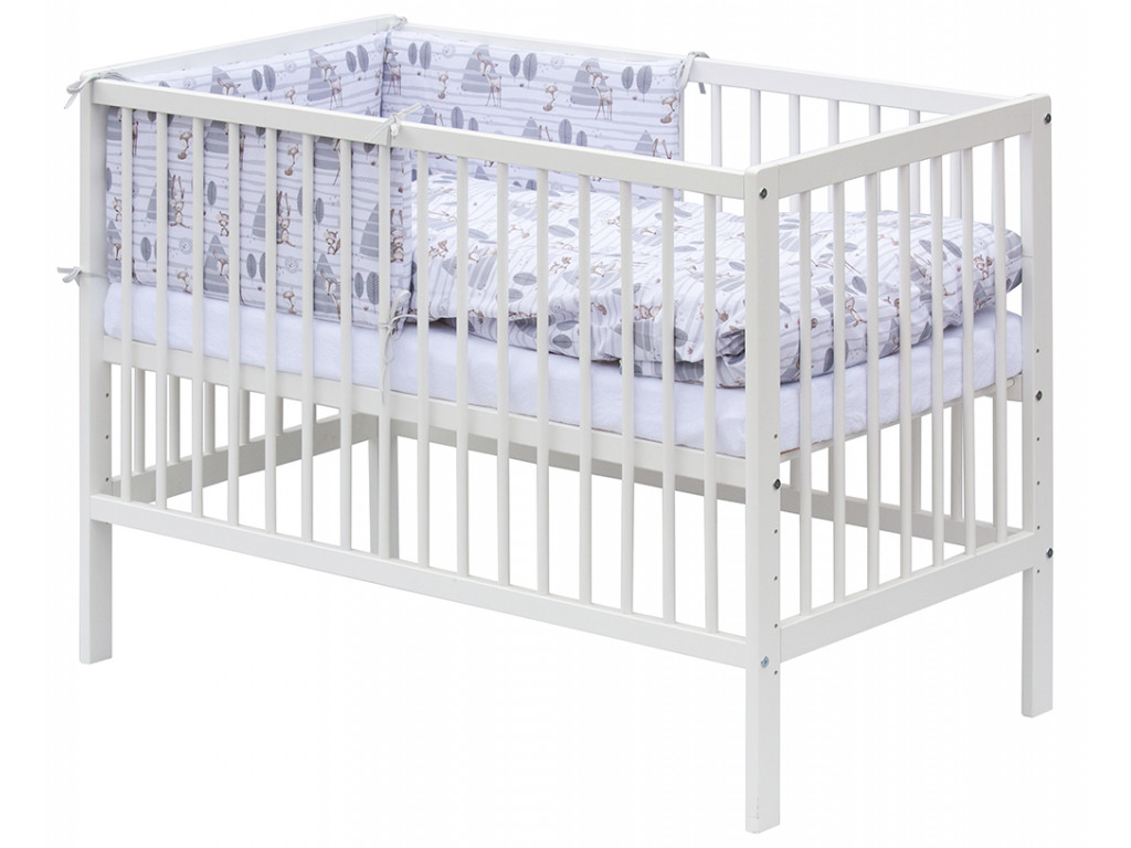 Detská postieľka z masívu (borovica) je klasického dizajnu a poslúži rodičom na dlhšie obdobie, pretože sa dá prispôsobiť rastu dieťaťa. Rošt postieľky sa dá nastaviť do šiestich polôh. Postupne ako dieťa rastie, rošt sa posúva smerom nadol. Postieľka má aj vyberateľné priečky a tak staršie dieťa môže po zobudení kedykoľvek vyjsť z postieľky samé. Zakúpením tejto postieľky je v cene aj kompletná súprava pre bábätko, ktorá obsahuje matrac, vankúš, perinku, plachtu a ochranný mantinel i obliečky sivej farby s detským motívom srnčeka.