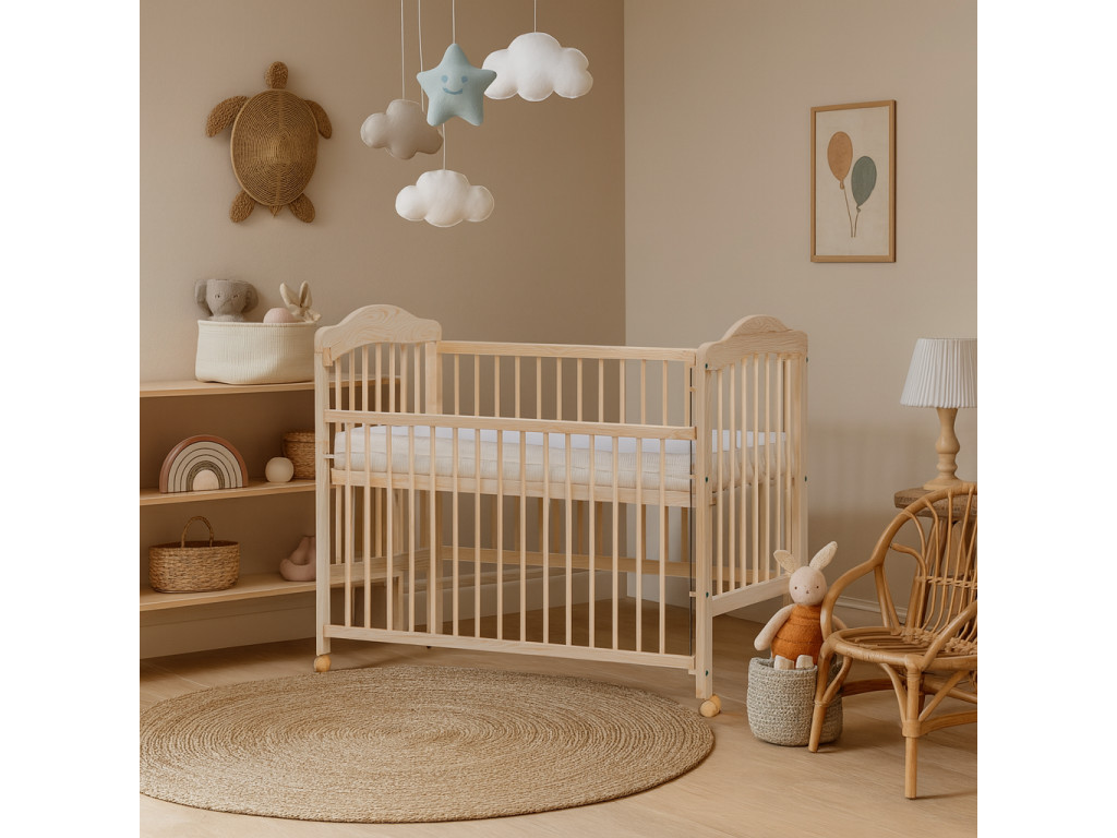 Ladné tvary robia z tejto postieľky pre deti vznešený kúsok nábytku do detskej izby. Detská postieľka z borovicového masívu poslúži novorodencom aj batoľatám, pretože sa dá prispôsobiť rôznym vývojom dieťaťa. Rošt sa dá nastaviť do šiestich polôh a bočná strana je sťahovacia. Zakúpením tejto postieľky získate istotu a bezpečie pre vaše dieťa a možnosť využitia pre ďalší prírastok do rodiny, a to aj po niekoľko generácií.