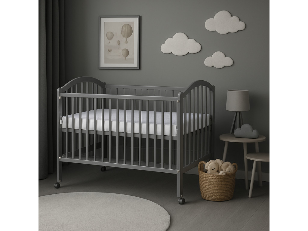 Sivá detská postieľka z borovicového masívu obsahuje nastaviteľný rošt do piatich polôh a bočnú sťahovaciu stranu, môžete ju tak prispôsobiť novorodencovi, ale aj dieťaťu do veku do 3 rokov.