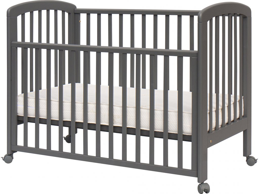 Sivá detská postieľka z brezového dreva obsahuje nastaviteľný rošt do troch polôh a bočnú sťahovaciu stranu, môžete ju tak prispôsobiť novorodencovi, ale aj dieťaťu do veku 3 rokov.