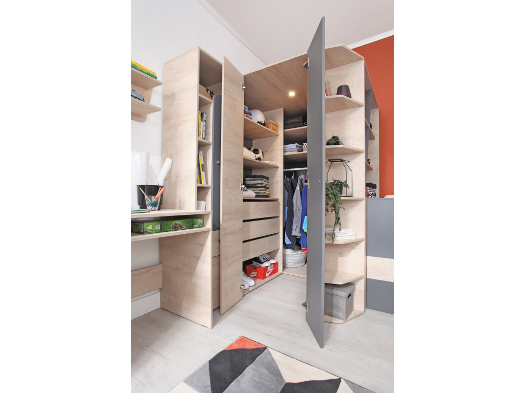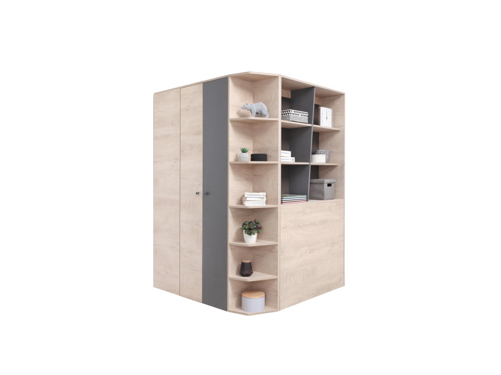 Rohová skriňa Delta DL1 zaujme po vizuálnej stránke, no o nič horšie nie je na tom ani čo sa týka úložnej plochy. Skriňa disponuje otvoreným úložným priestor na odloženie kníh, boxov, školských pomôcok a dekoratívnych predmetov bez toho aby ste ju vôbec museli otvoriť. To pravé orechové však príde až po otvorení dverí, kedy skriňa ponúkne veľký vnútorný priestor s ďalšími otvorenými poličkami a závesnou tyčou. V skrini tak okrem oblečenia, nájdu svoje miesto aj športové potreby, hračky, alebo sezónne vecí či odevné doplnky.