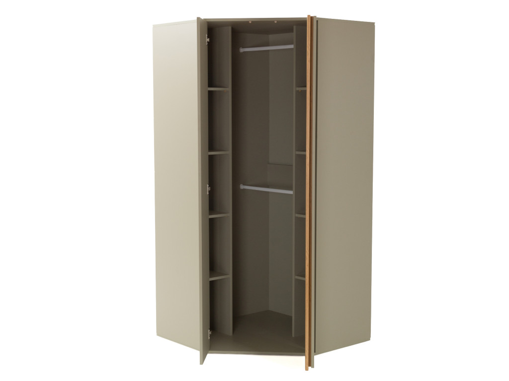 Rohová skriňa je vnútri rozdelená na 3 časti. Po bokoch sú dve časti so 4 policami na každej strane. Stredná hlbšia časť skrine obsahuje dve tyče na vešanie oblečenia.