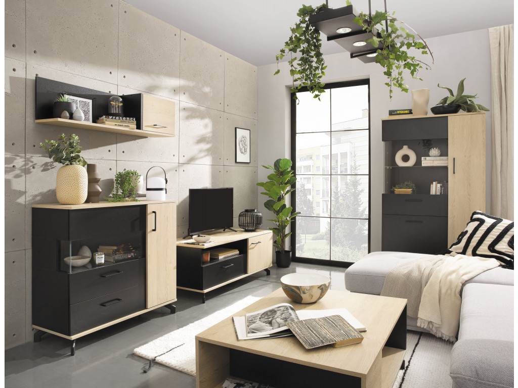 Úzka 2-dverová čierna skriňa poskytne úložný priestor navyše a zároveň zjednotí každý interiér. Je vybavená 2 zásuvkami a skrinkami, do ktorých môžete odložiť všetky dekorácie a potrebné veci. Kombinácie prírodnej a čiernej farby dodá každému štýlu miestnosti elegantný vzhľad.