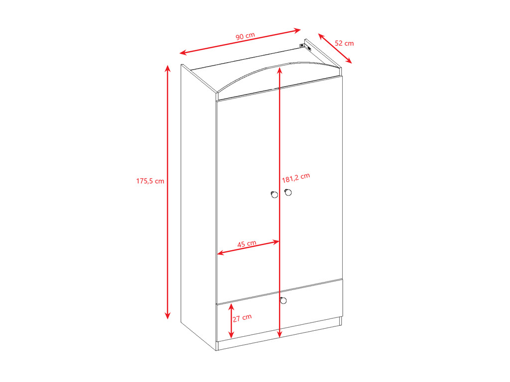 Skriňa je dvojdverová, rozdelená na 2 časti. Jedna polovica obsahuje tyč na zavesenie oblečenia a druhá má 3 police. V spodnej časti skrine sa nachádza 1 priestranná zásuvka.