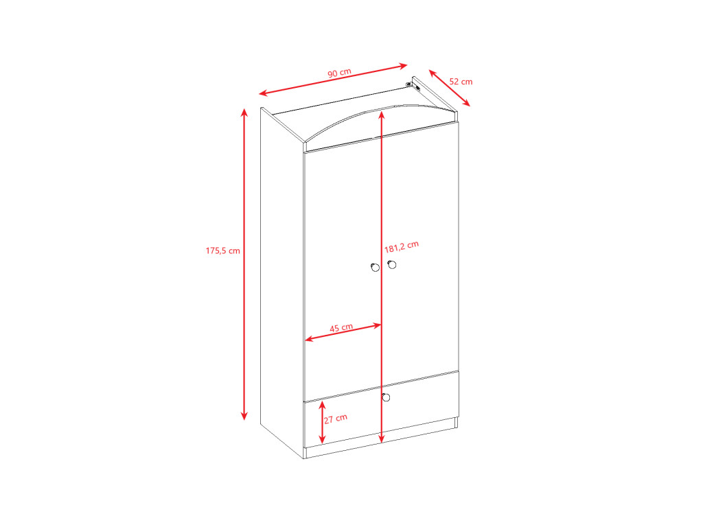 Skriňa je dvojdverová, rozdelená na 2 časti. Jedna polovica obsahuje tyč na zavesenie oblečenia a druhá má 3 police. V spodnej časti skrine sa nachádza 1 priestranná zásuvka.