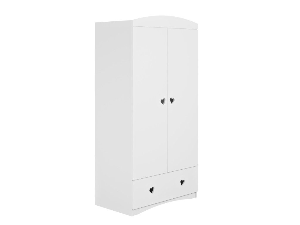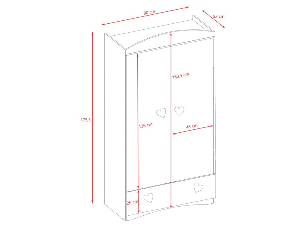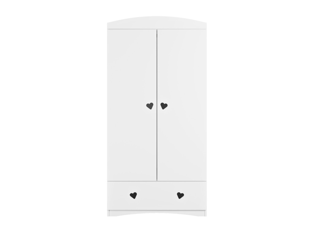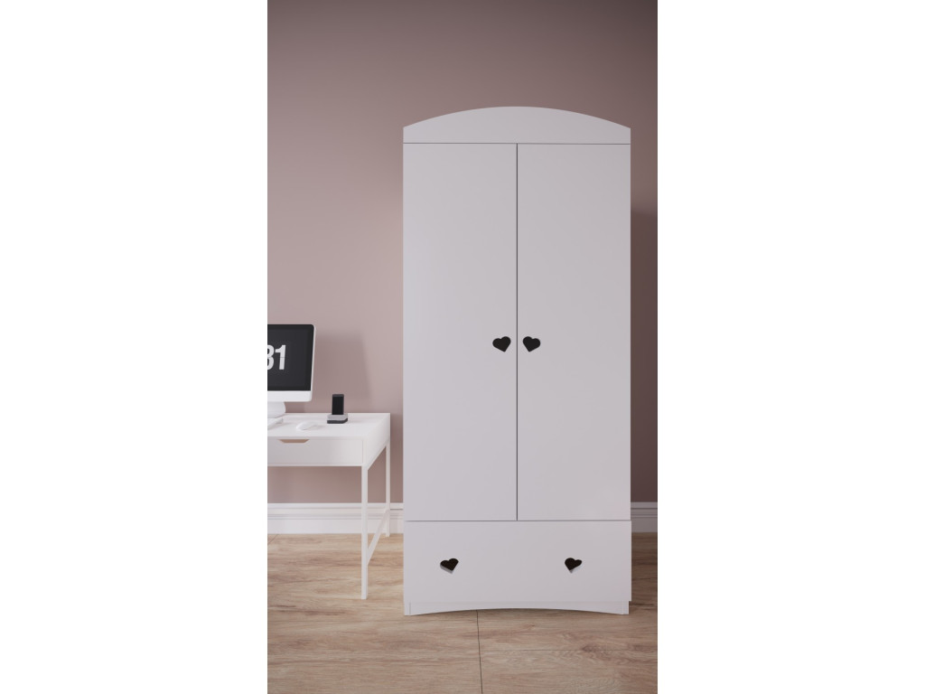 Dvojdverová skriňa Julia je rozdelená na dve časti. Na pravej strane sú 3 priestranné police (každá má nosnosť 5 kg) a na ľavej strane je tyč na vešanie oblečenia. V spodnej časti skrine sa nachádza jedna priestranná zásuvka (nosnosť 3 kg). Ladný dizajn skrine je vďaka srdiečkovému vzoru, ktorý nahrádza otváracie madlá.