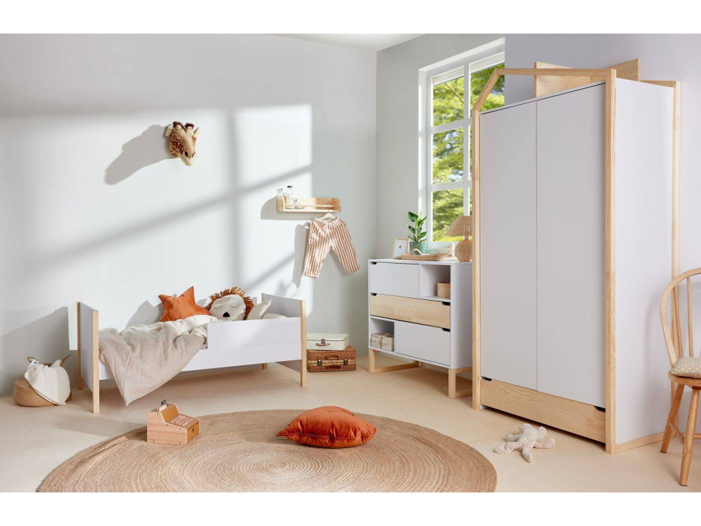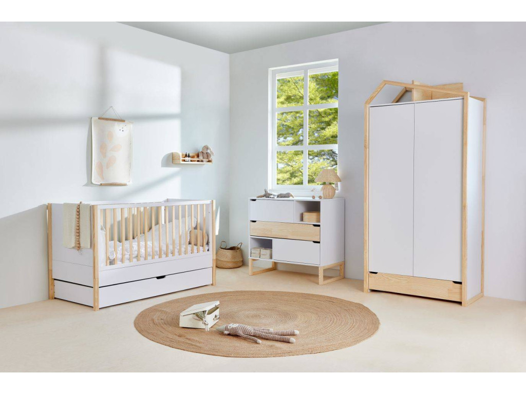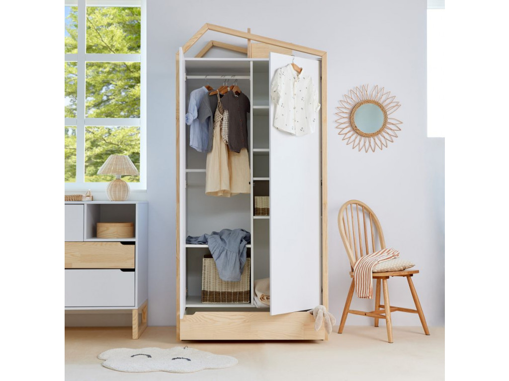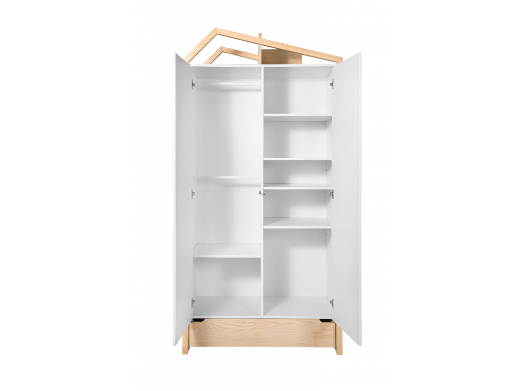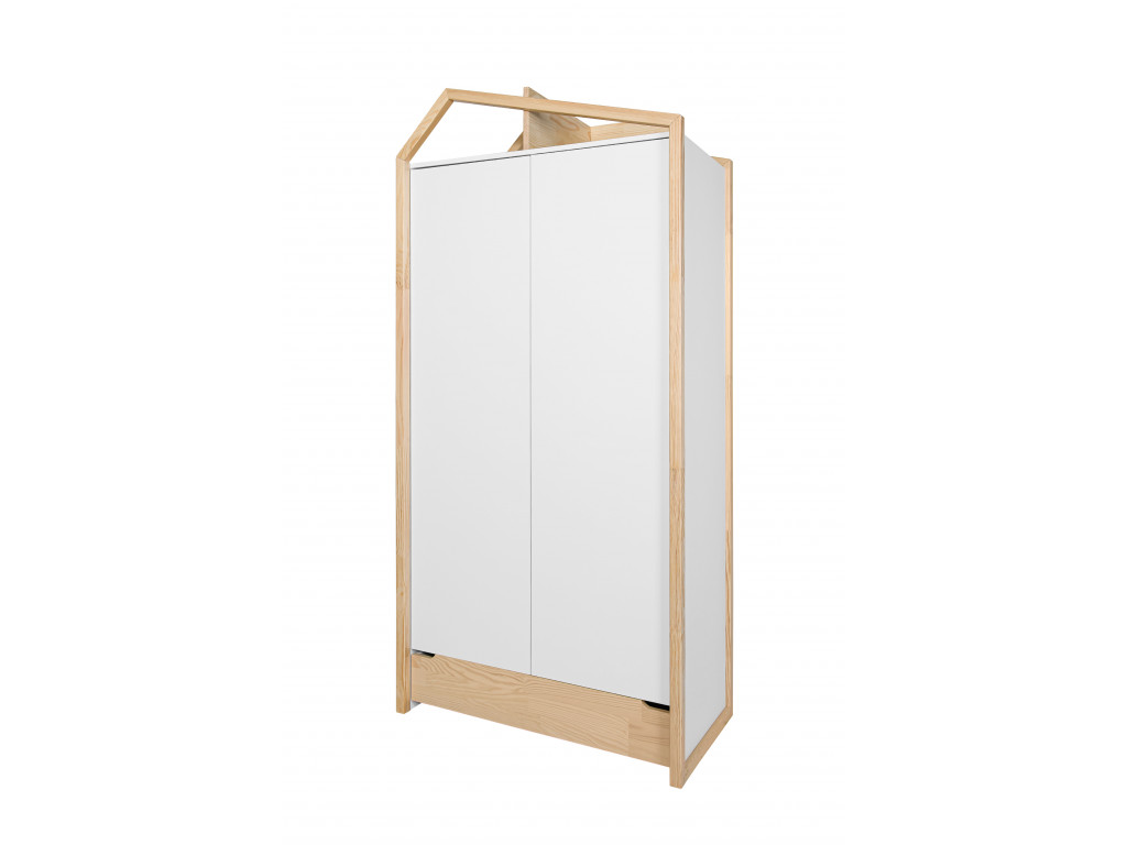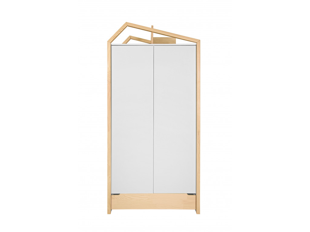 Jedinečná detská skriňa Tatam vychádza z elegantnej kolekcie nábytku Tatam, ktorý je vhodný na zariadenie každej detskej izby. Farebná kombinácia bielej s prírodným materiálom a dizajn domčeka sa hodí do detskej izby pre chlapčeka aj dievčatko.
