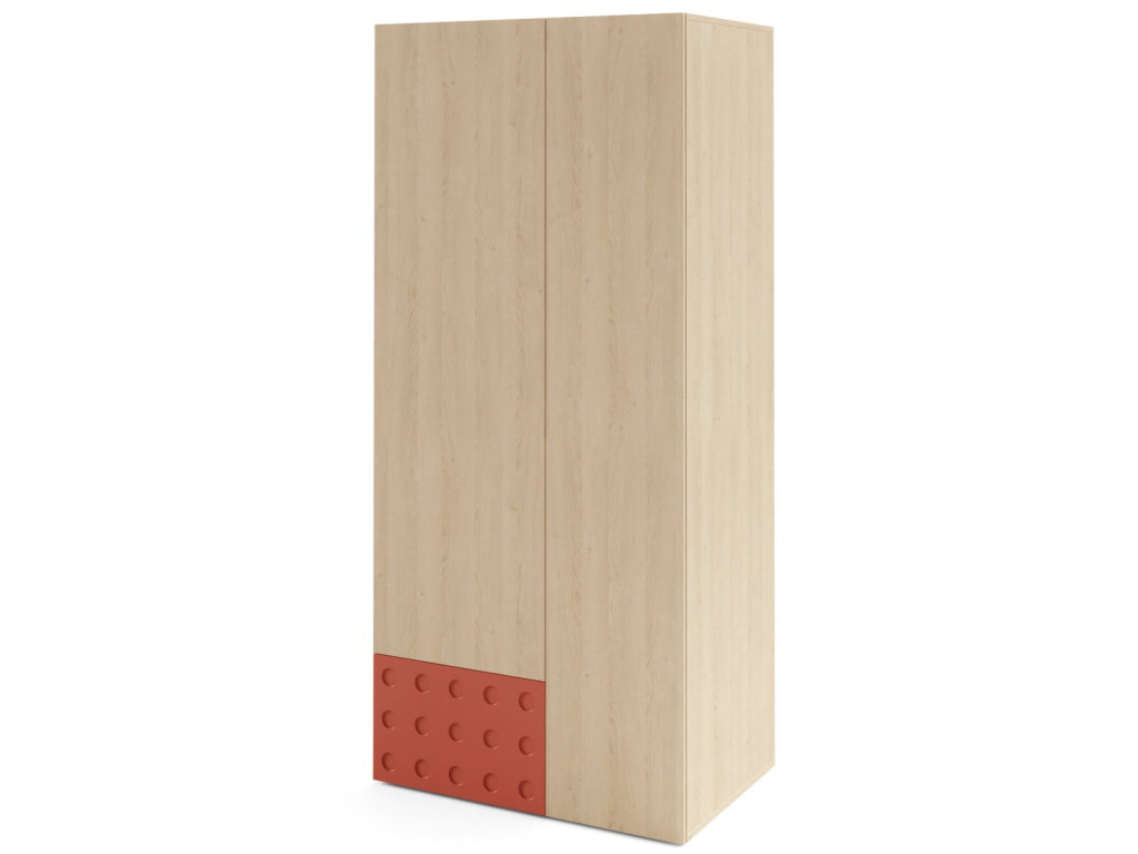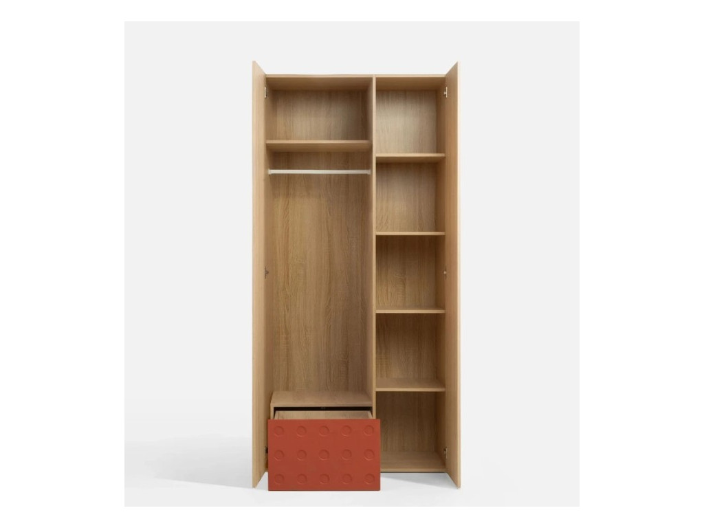 Dvojdverová šatníková skriňa Salsa SL2 ponúka prakticky členený úložný priestor vhodný do mládežníckej alebo študentskej izby. V ľavej spodnej časti sa nachádza zásuvka, nad ktorou je priestor s vešiakovou tyčou určený na zavesenie oblečenia a nad ním polica. Pravá časť skrine je riešená štyrmi policami umiestnenými zhora nadol, ktoré poskytujú dostatok miesta na uloženie oblečenia, kníh alebo doplnkov. Farebné prevedenie dub piškótový s oranžovým akcentom dodáva skrini výrazný a moderný charakter.