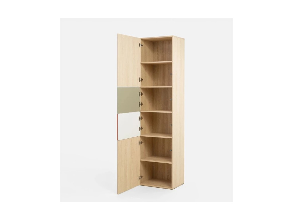 Vysoká policová skriňa Salsa SL4 je uzavretá skriňa so štyrmi dvierkami, ktorá ponúka veľkorysý úložný priestor riešený policami. Vďaka výške je ideálna na efektívne využitie priestoru v mládežníckej alebo študentskej izbe. Dvierka sú vyhotovené vo všetkých farbách kolekcie Salsa, čím vytvárajú dynamický a moderný vzhľad. Kombinácia dekoru dub s farebnými akcentmi dodáva skrini výrazný charakter.