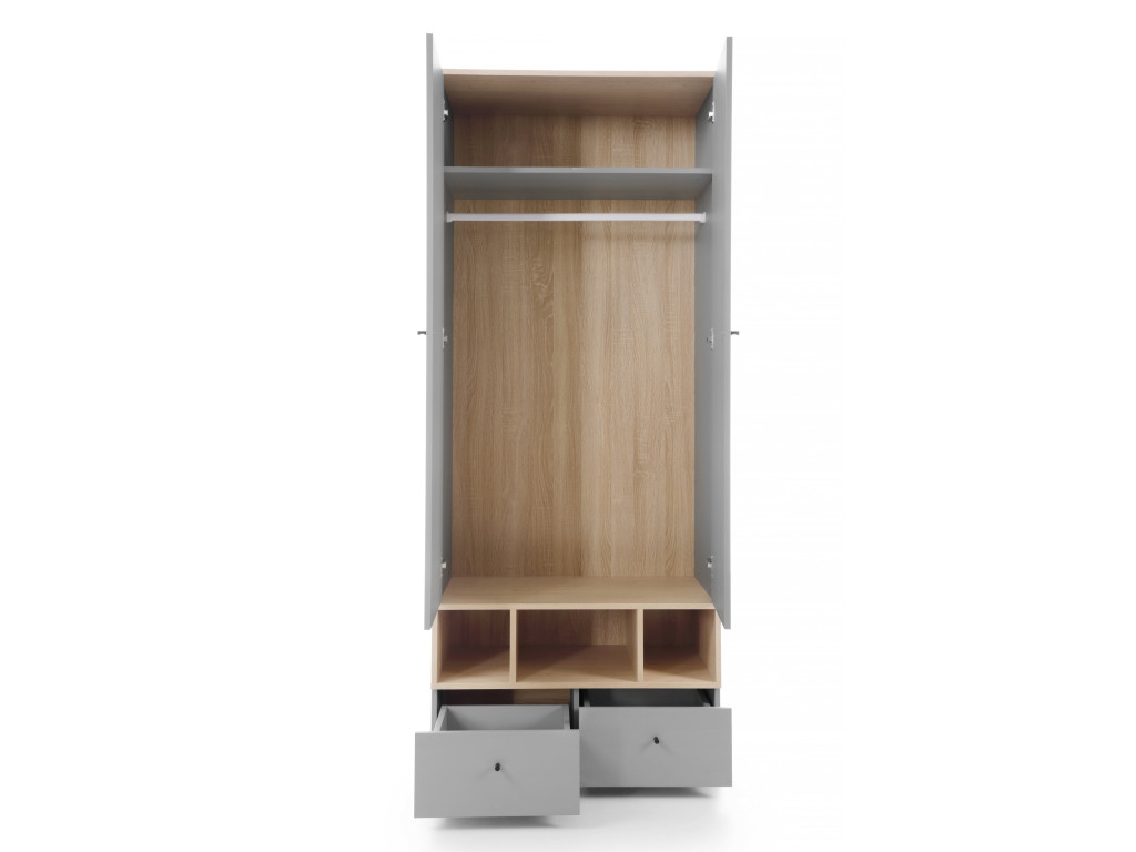 Šatníková skriňa Oriko 01 spája moderný dizajn so skvelou funkcionalitou. V dvojdverovom priestore sa nachádza polica a vešiaková tyč, pod ktorými je otvorená časť rozdelená tromi policami po celej šírke skrine. V spodnej časti nájdete dve menšie zásuvky, ktoré poskytnú dodatočný úložný priestor. Vďaka kombinácii sivej farby a dekoru dub pôsobí skriňa štýlovo a neutrálne, čím sa ľahko hodí do akéhokoľvek študentského či tínedžerského interiéru.