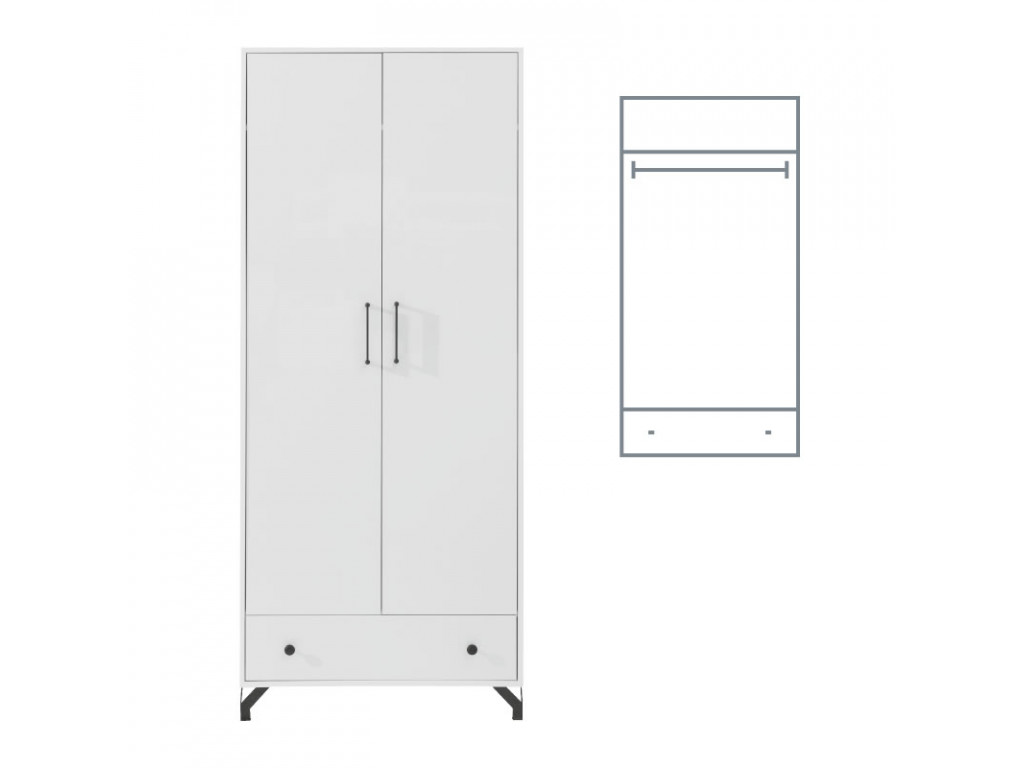 Elegantná 2-dverová skriňa Bergen BE1 v trendovej bielej farbe s kontrastnými čiernymi úchytkami i nožičkami. Okrem príťažlivého dizajnu uvítate úložný priestor, vďaka ktorému budú odevy i odevné doplnky uložené prehľadne.