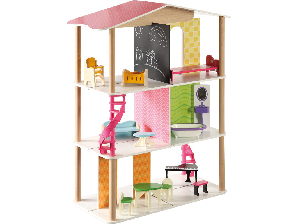 Otvorený domček pre bábiky je vyrobený spolu s doplnkami z pevného dreva. Deťom ponúka až 3 poschodia s 5 plne vybavenými miestnosťami. Tráviť čas tak môžu v jedálni s klavírnym krídlom, obývačke s gaučom, kúpeľni s vaňou, v spálni či detskej izbičke. Podlažia sú prepojené ružovým točeným schodiskom.