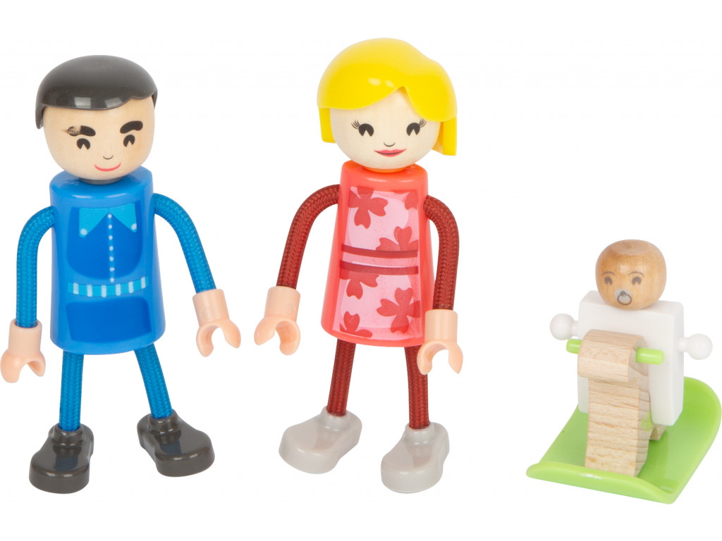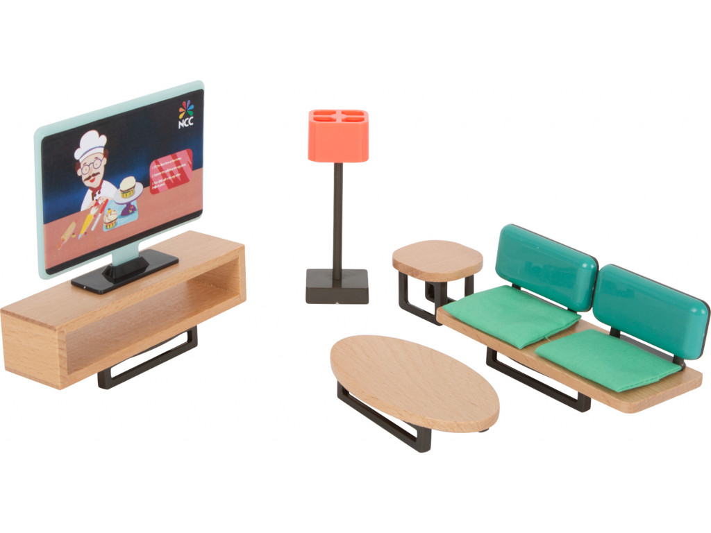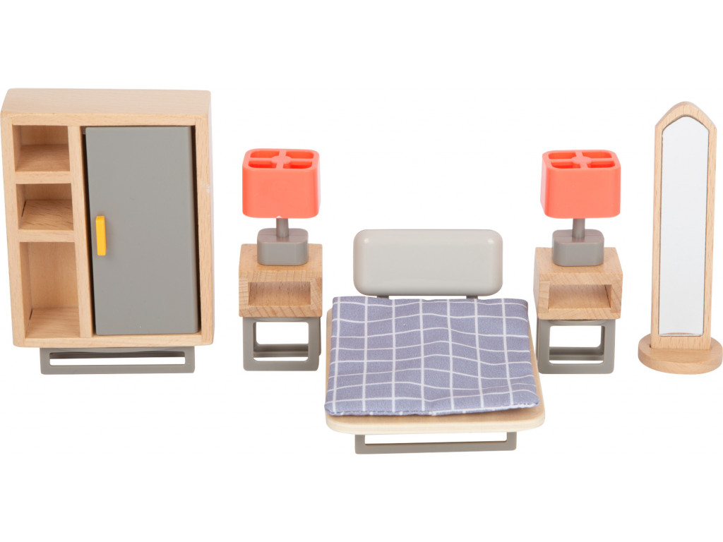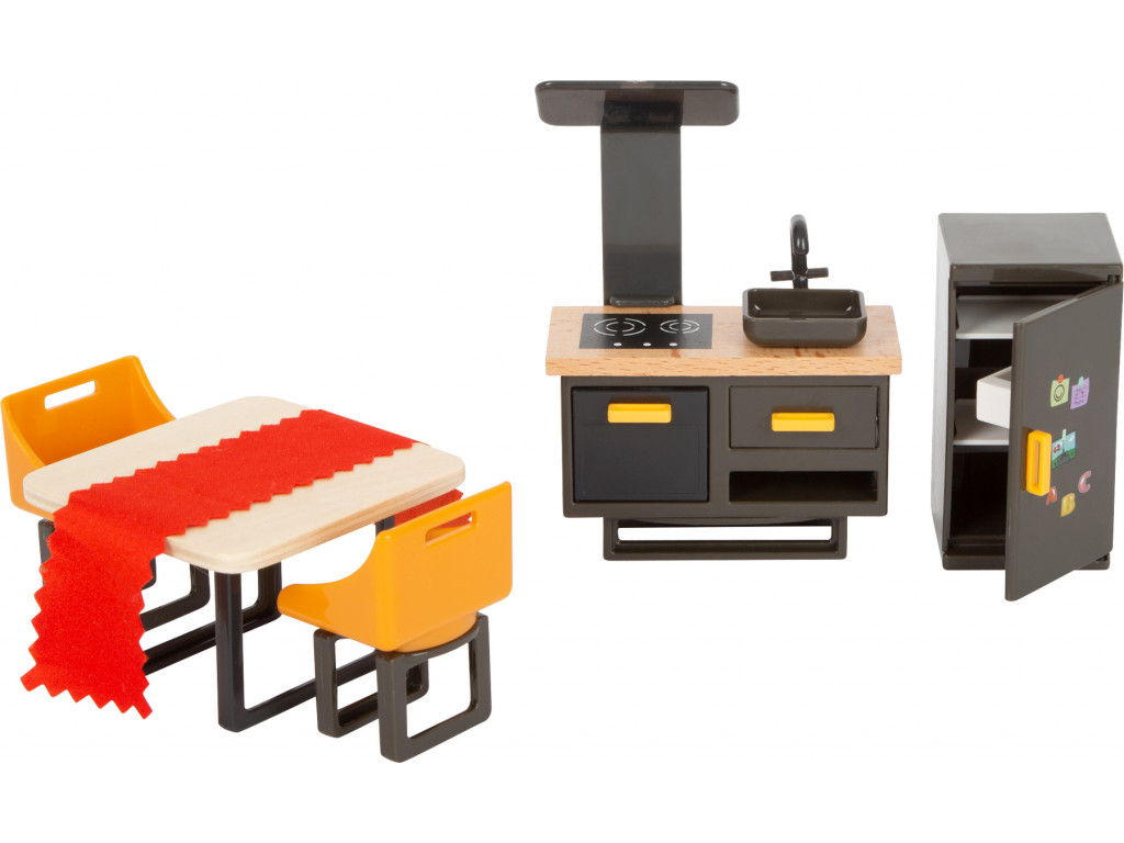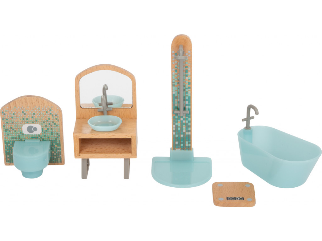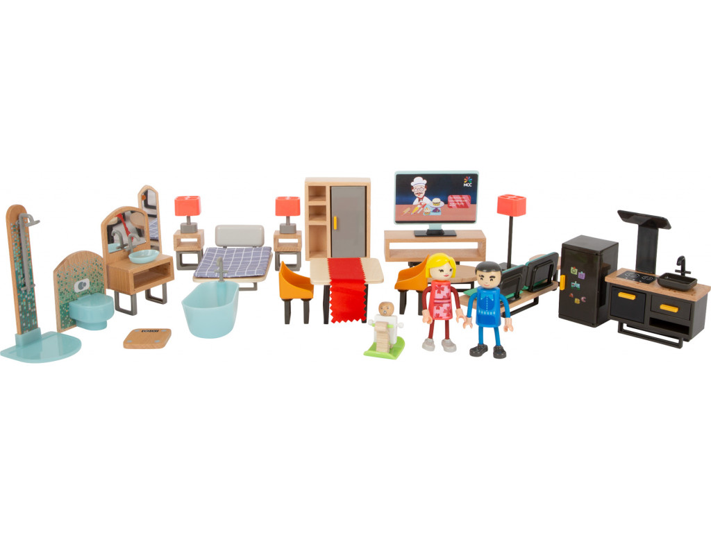 Kompletná sada nábytku do domčeka pre bábiky. S touto rozsiahlou sadou si deti budú môcť vybaviť svoj domček štýlovo. V balení nájdete chladničku, kuchynskú linku so sporákom a digestorom, stôl a stoličky, nočné stolíky, lampu, gauč, konferenčný stolík, vaňu, sprchovací kút, umývadlo so zrkadlom, toaletu, váhu. Ďalej tiež 3 figúrky, ktoré sa môžu v domčeku udomácniť. Nábytok je z veľkej časti drevený, vhodný pre bábiky do 12 cm. Táto moderná a obzvlášť rozsiahla sada nábytku pre bábiky je ideálnym doplnkom radu domčekov pre bábiky a boduje súčasným štýlom vybavenia, ktorý nadväzuje na obľúbený interiérový trend.