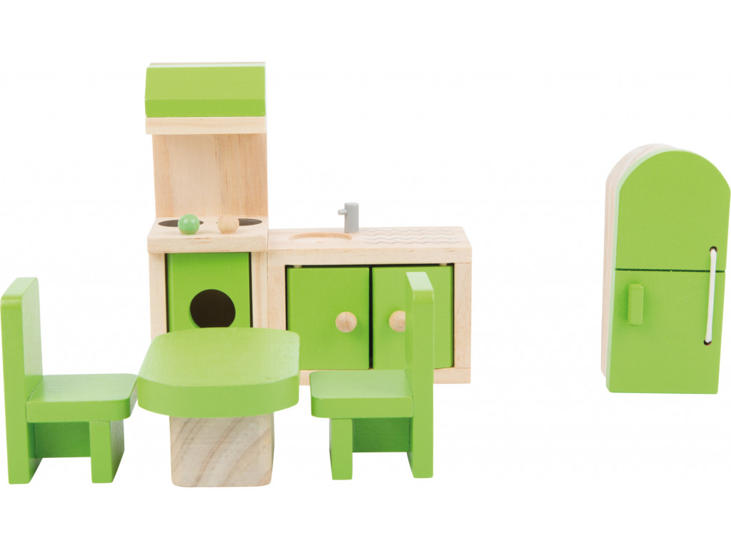 Má vaša slečna domček pre bábiky, ale v ňom málo nábytku? Čo tak zaobstarať jej vybavenie kuchyne v žiarivej kombinácii zelenej farby s prírodným drevom. Sada nábytku do kuchyne obsahuje kuchynskú linku, chladničku, stôl a dve stoličky.