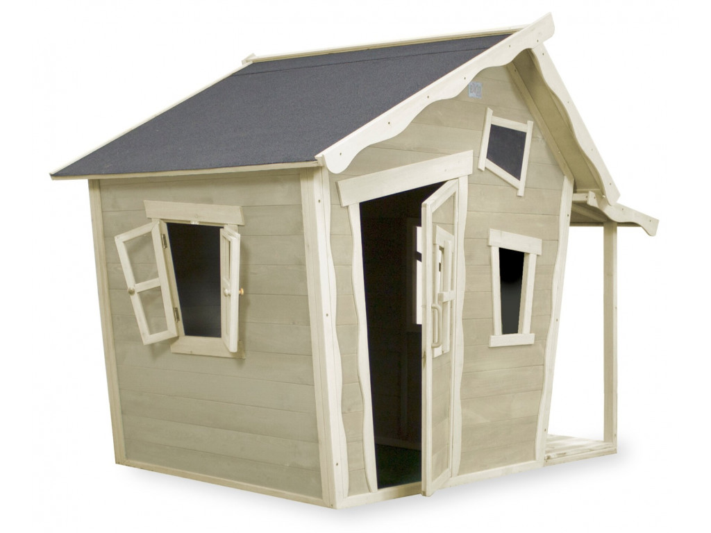 Záhradný domček pre deti na hranie EXIT Crooky 150 v šedo-béžovej farbe je dizajnový 'zrub', kde deti môžu stráviť hodiny zábavy. Tento drevený domček na hranie stojí na zemi s verandou a nezaberá takmer žiadne miesto. Prefabrikované panely uľahčia montáž domčeka, ktorý zvládnu 2 dospelé osoby. Detský drevený domček na hranie EXIT Crooky 150 má prírodný vzhľad a hravý dizajn, vrátane šikmých okien, šikmej strechy a šikmých dverí.